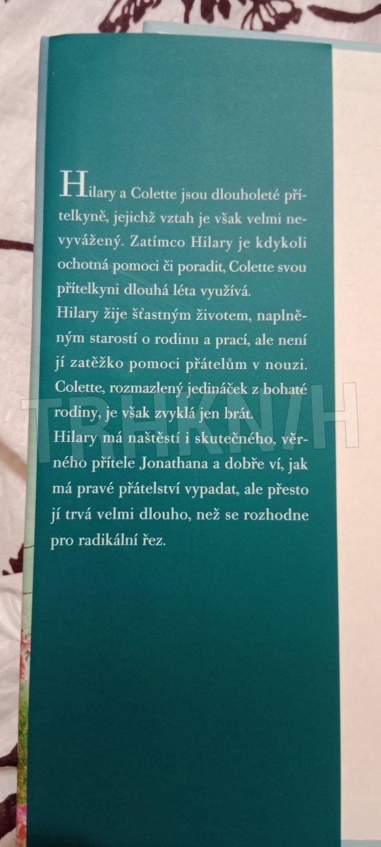 Kam až sahá přátelství? A kdy je načase, abychom přestali létat za oceán kvůli někomu, kdo by pro nás nepřeskočil ani louži? Hilary a Colette jsou dlouholeté přítelkyně, jejichž přátelství je však velmi nevyvážené. Zatímco Hilary je kdykoli ochotná pomoci či poradit, Colette svou přítelkyni dlouhá léta využívá.Hilary žije šťastným životem, naplněným starostí o rodinu a prací, ale není jí zatěžko pomoci přátelům v nouzi. Colette, rozmazlený jedináček z bohaté rodiny, je však zvyklá jen brát. Hilary má naštěstí i skutečného, věrného přítele Jonathana a dobře ví, jak má pravé přátelství vypadat, ale přesto jí trvá velmi dlouho, než se rozhodne pro radikální řez.