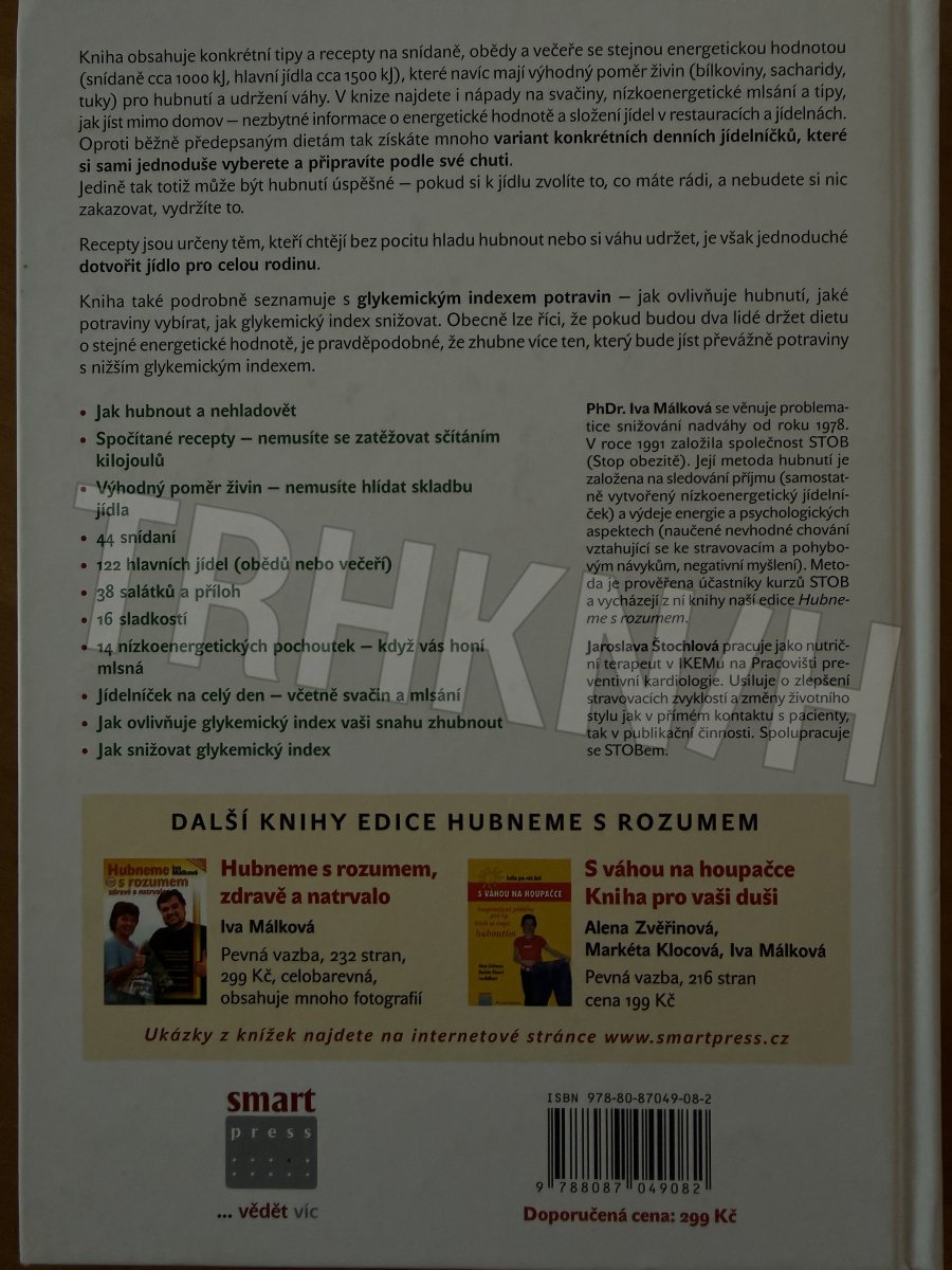 Knihu Hubneme s rozumem v praxi napsala známá odbornice na výživu autorka Iva Málková. Kniha Hubneme s rozumem v praxi Glykemická kuchařka obsahuje konkrétní tipy a recepty které navíc mají výhodný poměr živin pro hubnutí a udržení váhy. V knize najdete nápady na svačiny, nízkoenergetické mlsání a tipy, jak jíst mimo domov – nezbytné informace o energetické hodnotě a složení jídel v restauracích a jídelnách. Oproti běžně předepsaným dietám tak získáte mnoho variant konkrétních denních jídelníčků, které si sami a jednoduše vyberete a připravíte podle své chuti. Recepty jsou určeny těm, kteří chtějí bez pocitu hladu hubnout nebo si váhu udržet, je však jednoduché dotvořit jídlo pro celou rodinu. Kniha Hubneme s rozumem v praxi také seznamuje podrobně s glykemickým indexem potravin. Autorka Iva Málková se problematice snižování nadváhy věnuje od roku 1978. Jaroslava Štochlová pracuje jako nutriční terapeutka. Kniha Hubneme s rozumem v praxi také seznamuje podrobně s glykemickým indexem potravin – jak ovlivňuje hubnutí, jaké potraviny vybírat, jak glykemický index snižovat. Obecně lze říci, že pokud budou dva lidé držet dietu o stejné energetické hodnotě, je pravděpodobné, že zhubne více ten, který bude jíst převážně potraviny s nižším glykemickým indexem.