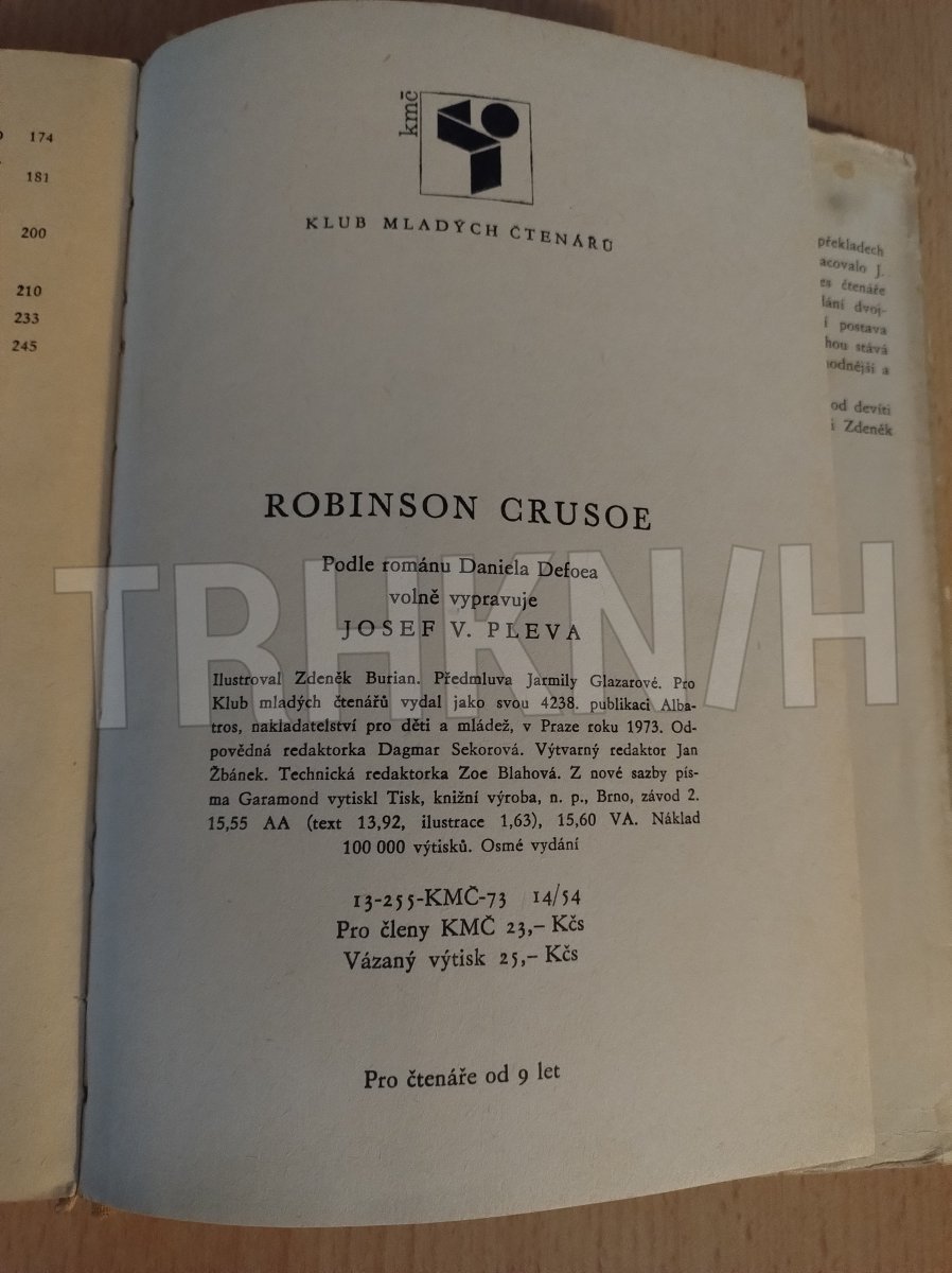 Klub mladých čtenářů, podle románu Daniela Defoe volně vypravuje Josef V. Pleva, předmluva Jarmila Glazarová, plátěná vazba s přebalem, běžný stav, ilustrace Zdeněk Burian, 256 stran