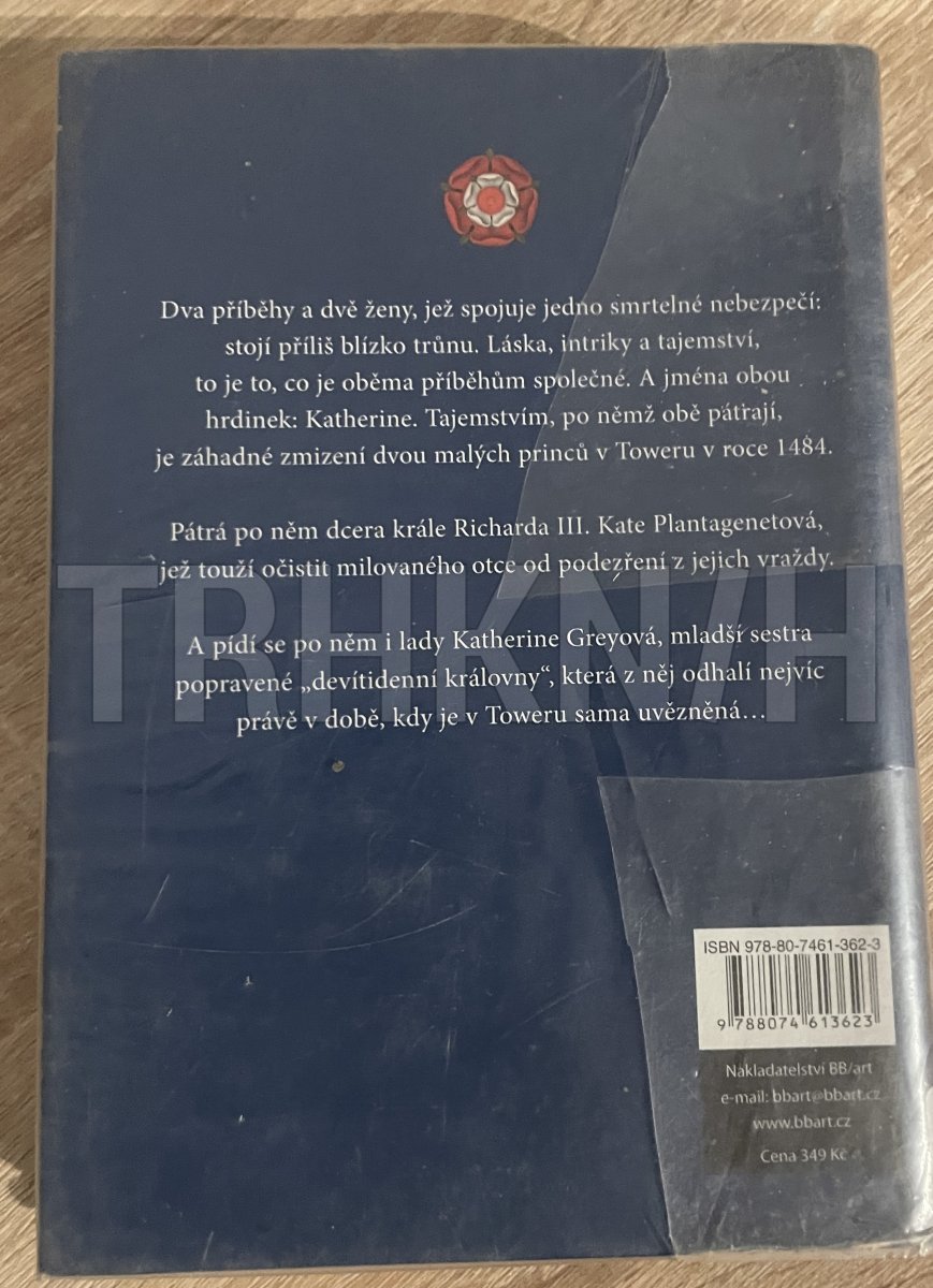 Dvě ženy, dva příběhy, dvě doby – a přece jako by mezi nimi exitovala jakási zvláštní, osudová spojitost. Dcera vévodů ze Suffolku Katherine Greyová, mladší sestra popravené „devítidenní královny“ Jany Greyové, nalezne jednoho dne ve věžní komnatě starého londýnského paláce zlatý přívěsek se safírem a svazek starých listin ovázaných zteřelou stuhou. Od té chvíle bude její život, který je plný tragických zvratů i vzácných okamžiků závratného štěstí, provázet neukojitelná touha odhalit totožnost pisatele oněch listin a spolu s tím i tajemství, o němž listiny pojednávají – záhadu zmizení dvou malých princů v Toweru, o nichž se od nepaměti traduje, že je dal zavraždit jejich strýc, král „hrbáč“ Richard III., aby se sám zmocnil anglického trůnu. Toto tajemství toužila odhalit i nepochybná pisatelka oněch listů a majitelka nalezeného šperku, Katherine Plantagenetová, mladičká nemanželská dcera mocichtivého krále. Ve vyprávění renomované historičky Weirové ožívají historické postavy dvou různých dob – konce 15. a poloviny 16. století – a skrze jejich životní příběhy čtenář sleduje dramatické události závěru válek dvou růží a nástupu Tudorovců na anglický trůn i počátky vlády Alžběty I. o osmdesát let později.