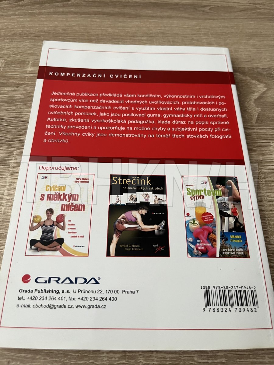 Jedinečná publikace předkládá všem kondičním, výkonnostním i vrcholovým sportovcům více než devadesát vhodných uvolňovacích, protahovacích i posilovacích kompenzačních cvičení s využitím vlastní váhy těla i dostupných cvičebních pomůcek, jako jsou posilovací guma, gymnastický míč a overball. Autorka, zkušená vysokoškolská pedagožka, klade důraz na popis správné techniky provedení a upozorňuje na možné chyby a subjektivní pocity při cvičení. Všechny cviky jdou demonstrovány na téměř třech stovkách fotografií a obrázků.
