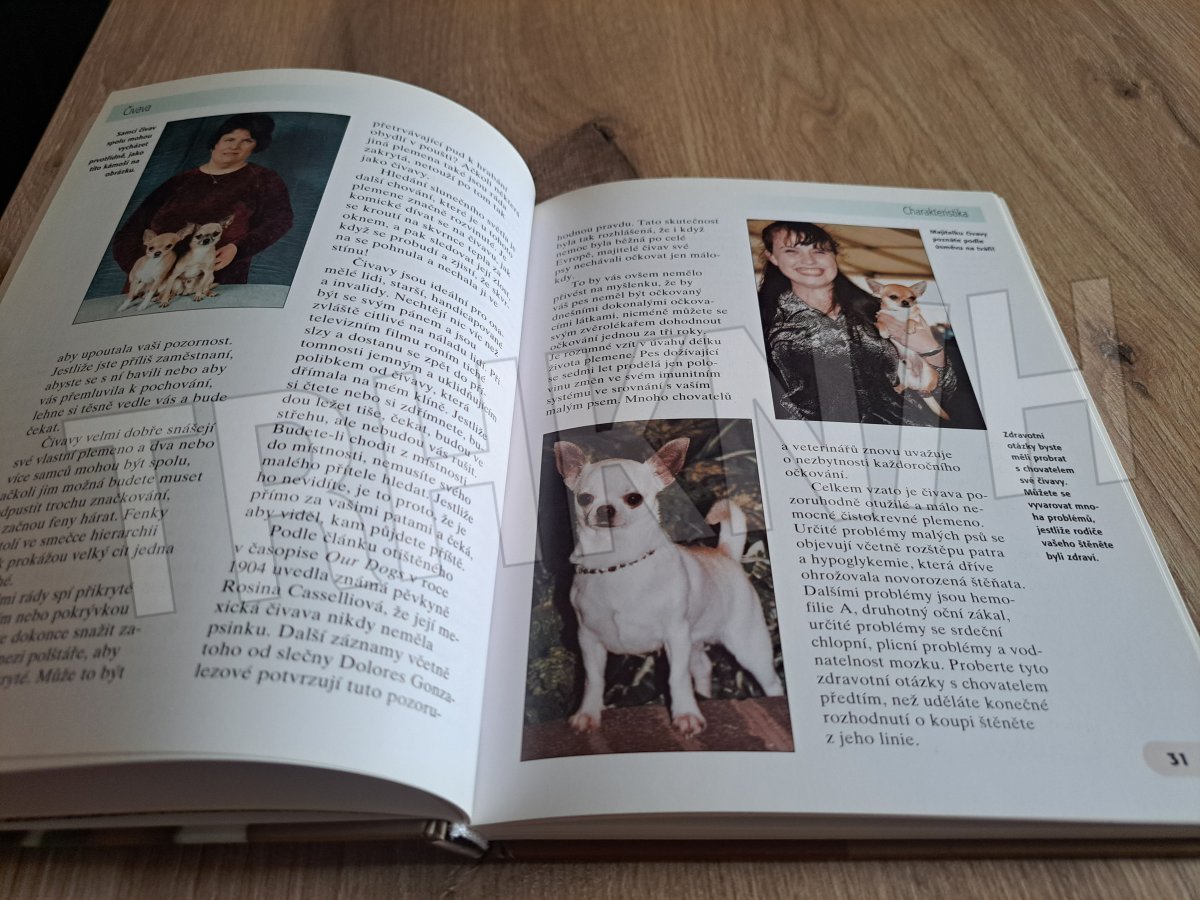 Kniha poskytuje velmi potřebné informace o čivavě a jejích předcích, o povaze a standardu, stejně jako o vhodném výběru, krmení, výchově, preventivní zdravotní péči a chováni tohoto plemene. Odborný text je doplněn 135 barevnými fotografiemi.