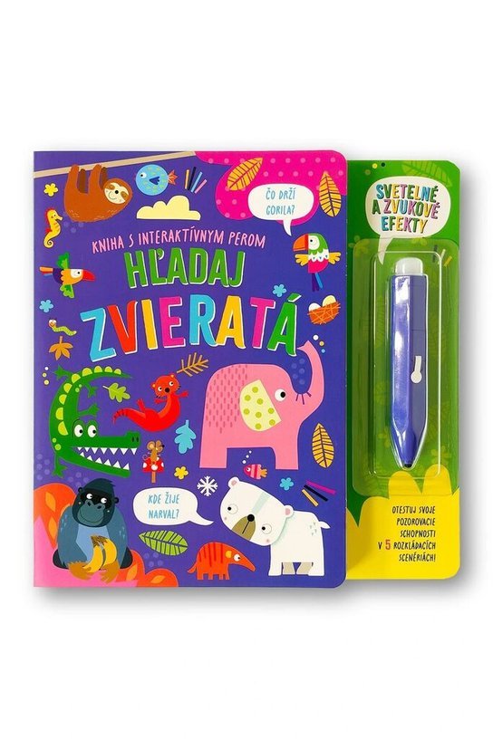 Koľko motýľov vidíš v džungli? Akú farbu má mrož? A kde žijú jazvece? Rozkladacie scenérie so zvieratami a otázky na jednotlivé obrázky otestujú detskú pozornosť a manipulácia s interaktívnym perom precvičí jemnú motoriku. Po zatlačení hrotom pera na čiernu bodku vo farebnom koliesku so správnou odpoveďou sa rozoznejú melódie a rozsvieti zelené svetlo, ktoré deti potešia a povzbudia na hľadanie ďalších správnych odpovedí.