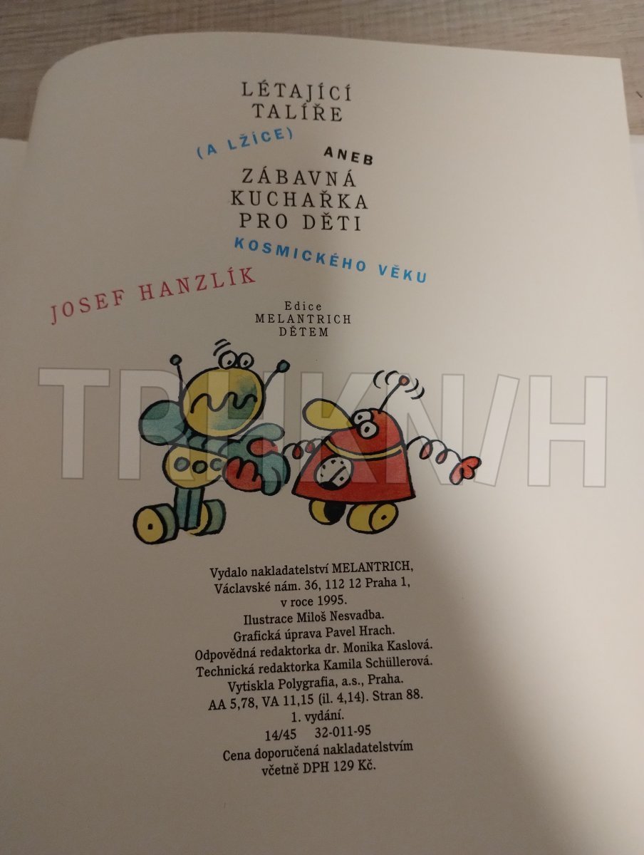 Létající talíře ( a lžíce ) , aneb zábavná kuchařka pro děti kosmického věku , Josef Hamzlík , ilustrace Miloš Nesvadba , vydal MELANTRICH , v roce1995 , vydání první , stran 88 , vazba tvrdá , stav jako nová ,