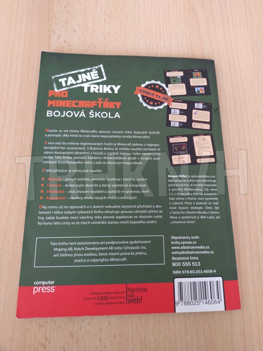 Naučte se od mistra Minecraftu spoustu nových triků, bojových technik a postupů, díky nimž se z vás stane neporazitelný nindža Minecraftu! S více než sto miliony registrovaných hráčů je Minecraft jednou z nejpopulárnějších her současnosti. S Bojovou školou se vmžiku naučíte zacházet se všemi dostupnými zbraněmi a kouzly a najdete slabinu i toho nejsilnějšího moba. Tato kniha pomůže každému Minecrafťákovi přežít v tvrdých podmínkách kostičkovaného světa a stát se obávaným bojovníkem. V této příručce se mimo jiné naučíte: - Bojovat – porazit zombie, pavouky, kostlivce i všechny ostatní - Čarovat – dodat svým zbraním a zbroji výjimečné schopnosti - Předvídat – znát chování nepřátel a zaútočit ve správnou chvíli - Rozpoznat – všechny druhy nových mobů a nebezpečí Díky tomu už na výpravách a v dolech nebudete zbytečně přicházet o zkušenosti i tězce nabyté vybavení! Kniha obsahuje spoustu obrázků přímo ze hry, takže budete moci všechny triky přesně zopakovat ve vlastním světě. Na konci této cesty se ze všech učedníků stanou mistři bojového umění. Megan Miller je spisovatelkou a redaktorkou na volné noze, která hraje počítačové hry už od dob Asteroidů a prvního Wolfensteina. Od verze 1.2 v Minecraftu létá na prasatech, hází Očima z Konce, staví pyramidy z cukrové třtiny a pokouší se najít nové bojové strategie. Dnes žije v Santa Fe v Novém Mexiku v biomu Mesa a společnost jí dělá Layla, její „ochočená vlčice“. Tato kniha není autorizována ani podporována společnostmi Mojang AB, Notch Development AB nebo Scholastic Inc. ani jinou osobou či společností, která vlastní autorská práva.
