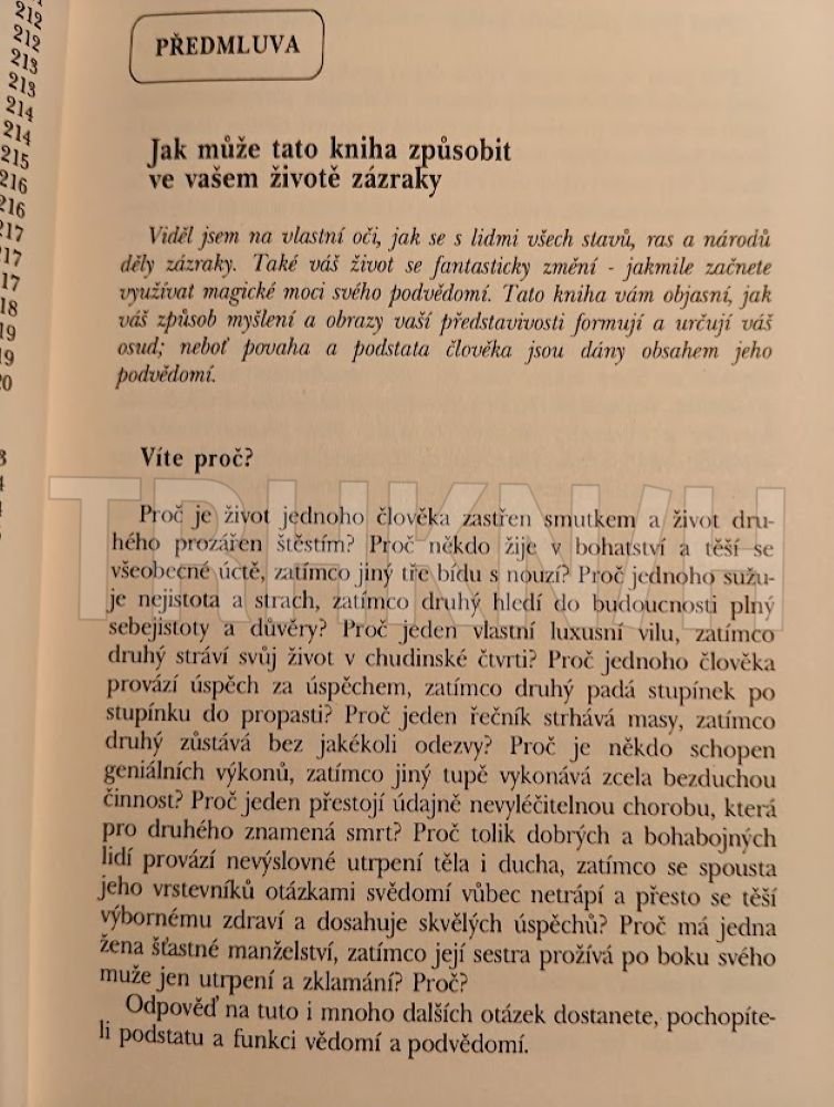 Představujeme vám světoznámý bestseller učitele pozitivního myšlení dr. J. Murphyho, význačného představitele proudu psychologického myšlení, jež vyzvedá úlohu podvědomí v lidské psychice. Podvědomí je podle autora dokonce rozhodující silou, která určuje nejen duševní, ale také tělesný a společenský rozvoj člověka. Dr. Murphy na množství konkrétních příkladů uvádí, jak postupovat, aby člověk dosáhl úspěchu v zaměstnání, podnikání apod. Autor nám tak pomáhá při hledání kladných řešení našich životních situací. „Viděl jsem na vlastní oči, jak se s lidmi všech stavů, ras a národů děly zázraky. Také váš život se fantasticky změní – jakmile začnete využívat magické moci svého podvědomí. Tato kniha vám objasní, jak váš způsob myšlení a obrazy vaší představivosti formují a určují váš osud; neboť povaha a podstata člověka jsou dány obsahem jeho podvědomí.“