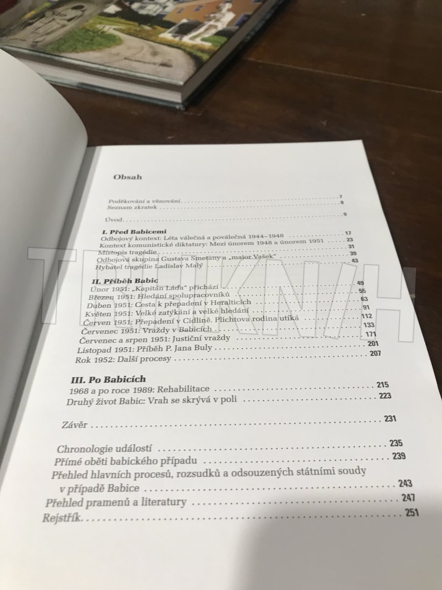 Babický případ z července 1951 otřásl celým tehdejším Československem. Tři mrtví na chodbě babické školy, následně akce bezpečnosti a další dva mrtví v bolíkovickém poli. Rychlý politický proces se sedmi tresty smrti. Další procesy, stovky odsouzených a další čtyři tresty smrti. Druhý příběh Babic pak přinesly hned dva díly seriálu Třicet případů majora Zemana. Kniha podrobně mapuje situaci na Vysočině mezi únorem a srpnem 1951, zejména činnost Ladislava Malého a postupy Státní bezpečnosti. Jsou zde vůbec poprvé publikovány některé archivní materiály a fotografie. Na základě tisíců stran materiálů bezpečnosti, vzpomínek aktérů a dalších dokumentů je vytvořen realistický obraz babického případu.