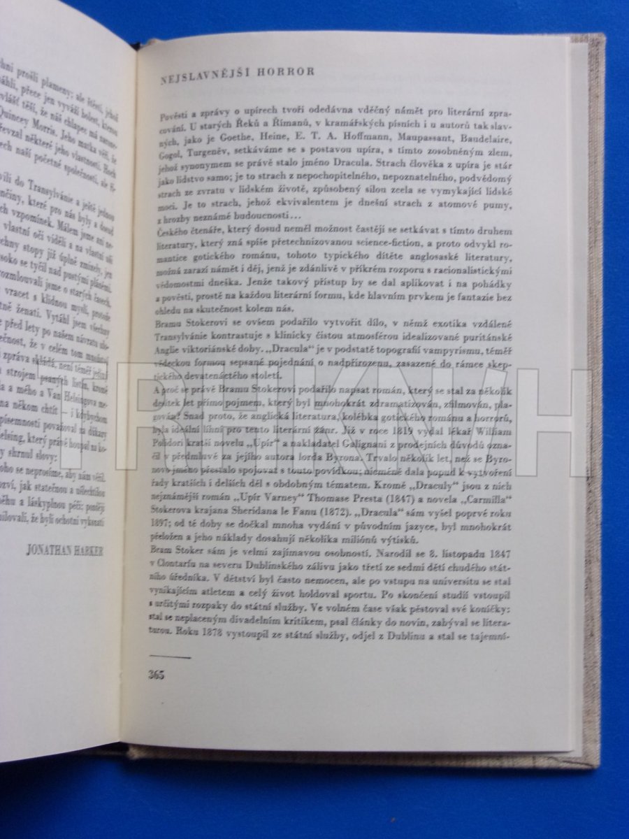 Románový horor anglického spisovatele (1847-1912), psaný formou dopisů, deníkových zápisů, líčení cest a výňatků z novin. Odehrává se v městkém prostředí viktoriánské Anglie a ve vzdálené, exoticky pojaté Transylvánii a líčí hrůzné činy hraběte Draculy - upíra, který se sytí lidskou krví, přičemž proti tomuto zosobněnému zlu bojuje hrstka ušlechtilých lidí v čele s holandským vědcem. O tomto románu se v doslovu říká, že "je v podstatě topografií vampyrismu, téměř vědeckou formou sepsané pojednání o nadpřirozenu, zasazené do rámce skeptického devatenáctého století".