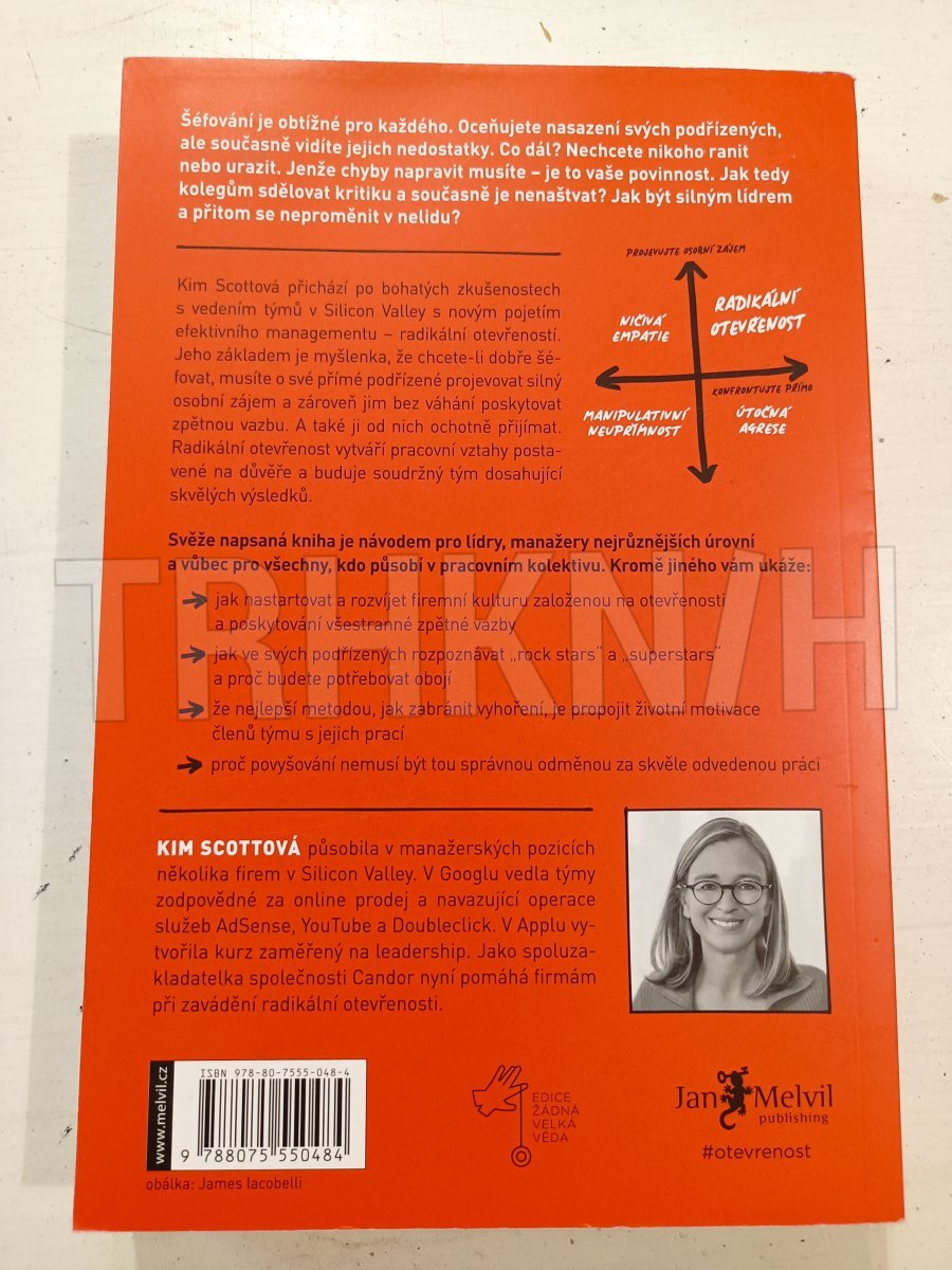 Kim Scottová přichází po bohatých zkušenostech s vedením týmů v Silicon Valley s novým pojetím efektivního managementu – radikální otevřeností. Jeho základem je myšlenka, že chcete-li dobře šéfovat, musíte o své přímé podřízené projevovat silný osobní zájem a zároveň jim bez váhání poskytovat zpětnou vazbu. A také ji od nich ochotně přijímat. Radikální otevřenost vytváří pracovní vztahy postavené na důvěře a buduje soudržný tým dosahující skvělých výsledků. Svěže napsaná kniha je návodem pro lídry, manažery nejrůznějších úrovní a vůbec pro všechny, kdo působí v pracovním kolektivu. Kromě jiného vám ukáže:- jak nastartovat a rozvíjet firemní kulturu založenou na otevřenosti a poskytování všestranné zpětné vazby - jak ve svých podřízených rozpoznávat „rock star“ a „superstar“ a proč budete potřebovat obojí - že nejlepší metodou, jak zabránit vyhoření, je propojit životní motivace členů týmu s jejich prací - proč povyšování nemusí být tou správnou odměnou za skvěle odvedenou práci.
