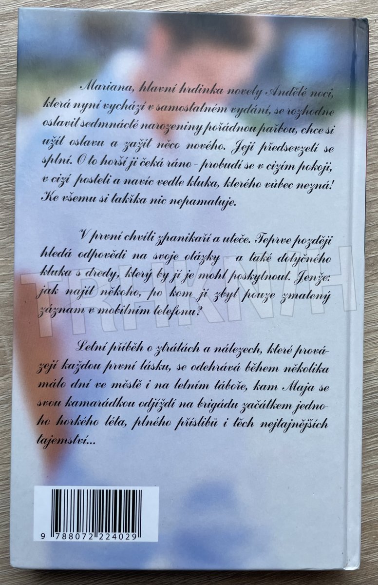 Mariana, hlavní hrdinka novely Andělé noci, která nyní vychází v samostatném vydání, se rozhodne oslavit sedmnácté narozeniny pořádnou pařbou, chce si užít oslavu a zažít něco nového. Její předsevzetí se splní. O to horší ji čeká ráno - probudí se v cizím pokoji, v cizí posteli a navíc vedle kluka, kterého vůbec nezná! Ke všemu si takřka nic nepamatuje. V první chvíli zpanikaří a uteče. Teprve později hledá odpovědi na svoje otázky - a také dotyčného kluka s dredy, který by jí je mohl poskytnout. Jenže: jak najít někoho, po kom jí zbyl pouze zmatený záznam v mobilním telefonu?
