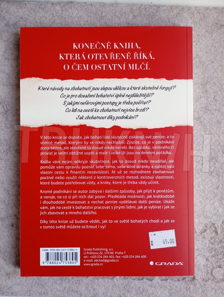 Které návody na zbohatnutí jsou slepou uličkou a které skutečně fungují? Co je pro dosažení bohatství úplně nejdůležitější? S jakými neférovými postupy je třeba počítat? Co lidi na cestě ke zbohatnutí nejvíce brzdí? Jak zbohatnout díky podnikání? V této knize se dozvíte, jak bohatí lidé skutečně získávají své peníze, a to včetně metod, kterými by se nikdy nechlubili. Zjistíte, co je v podnikání zcela běžné, ale otevřeně to dosud nikdo neřekl: bez úplatků, všimného či provizí je velmi obtížné uspět a malé i velké lži jsou na denním pořádku. Kniha vám nejen odkryje skutečnost, jak to dosud nikdo neudělal, ale pomůže vám opravdu poznat sebe sama, vaše silné stránky a nalézt vaši vlastní cestu k finanční nezávislosti.
