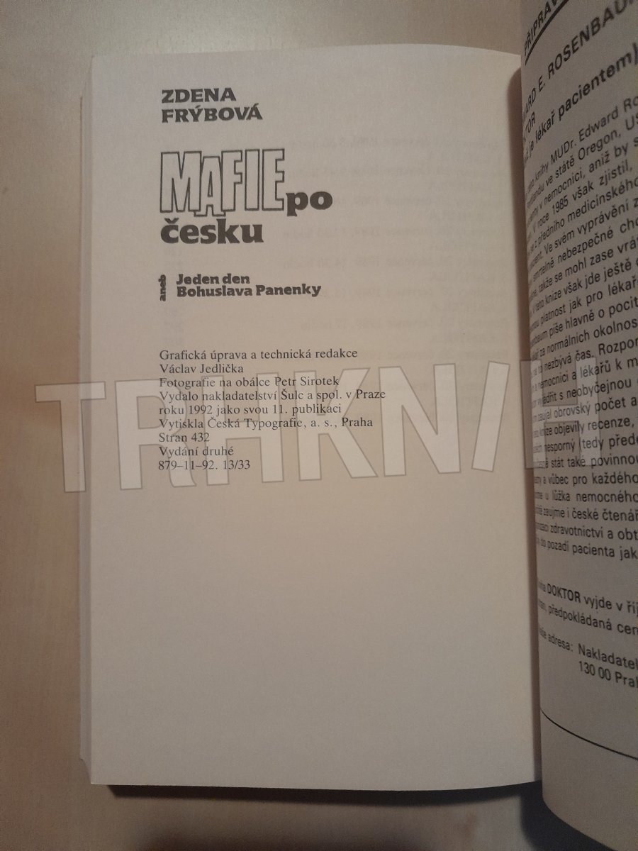 Mafie po česku aneb Jeden den Bohuslava Panenky Autor: Frýbová, Zdena Vydání: 2 Místo vydání: Praha Počet stran: 424 s. Rok vydání: 1992 Vazba: brožovaná Stav: dobrý Nakladatel: Šulc a spol Kategorie: Beletrie Edice, série: kniha Vytvořeno: 2021-12-14 11