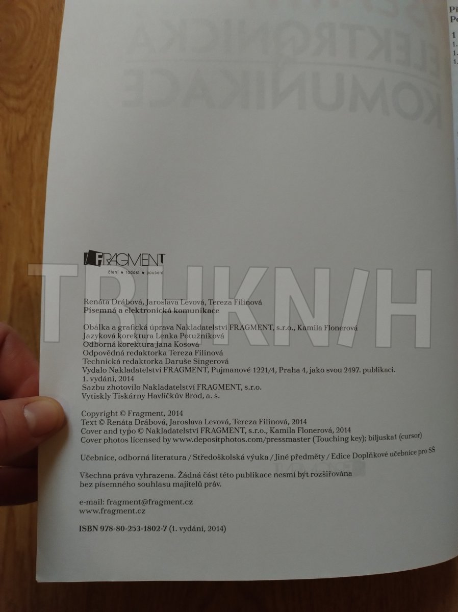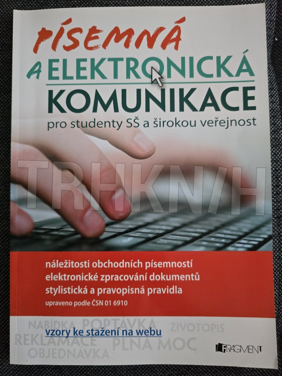 Jak napsat obchodní dopis, životopis nebo plnou moc? Jaké oslovení užít v e-mailu? Jak správně zpracovat elektronický dokument? Publikace Písemná a elektronická komunikace je určena studentům středních škol, ale i široké veřejnosti. Díky ní si poradíte s nejčastěji užívanými druhy obchodních písemností a s dokumenty, se kterými se běžně setkáváte. Zvládnete jejich elektronické zpracování, grafickou úpravu, pravopis i výběr vhodných slov. Náležitosti obchodních písemností a jiných dokumentů - elektronické zpracování a grafická úprava - stylistická doporučení a pravopisná pravidla - praktické úkoly na procvičení.