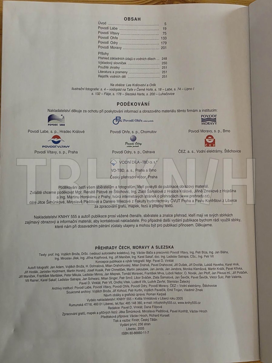 Výpravná publikace přináší vůbec poprvé ucelený popis a charakteristiku všech nejvýznamnějších vodních děl na území České republiky, členě-ných podle jednotlivých povodí: Labe, Vltava, Ohře, Odra a Morava. Představuje 136 přehrad a jejich historii, od vzniku projektu přes bu-dování až po současný stav. Bohatý obrazový materiál - historické fotografie, dobové pohlednice, letecké snímky... - dokumentuje výstav-bu vodních děl a technologická zařízení přehradních těles, jako jsou uzá-věry spodních výpustí, sdružené věžové objekty, bezpečnostní přelivy či vodní elektrárny. Nechybí mapky jednotlivých toků a příčné řezy hrází. Vedle technického popisu přehrad, z nichž některé byly vyhlášeny kulturními památkami, kniha populární formou seznamuje s jednotlivými účely vodních děl, s přírodními zajímavostmi v okolí a také využíváním nádrží k rekreaci a sportu.