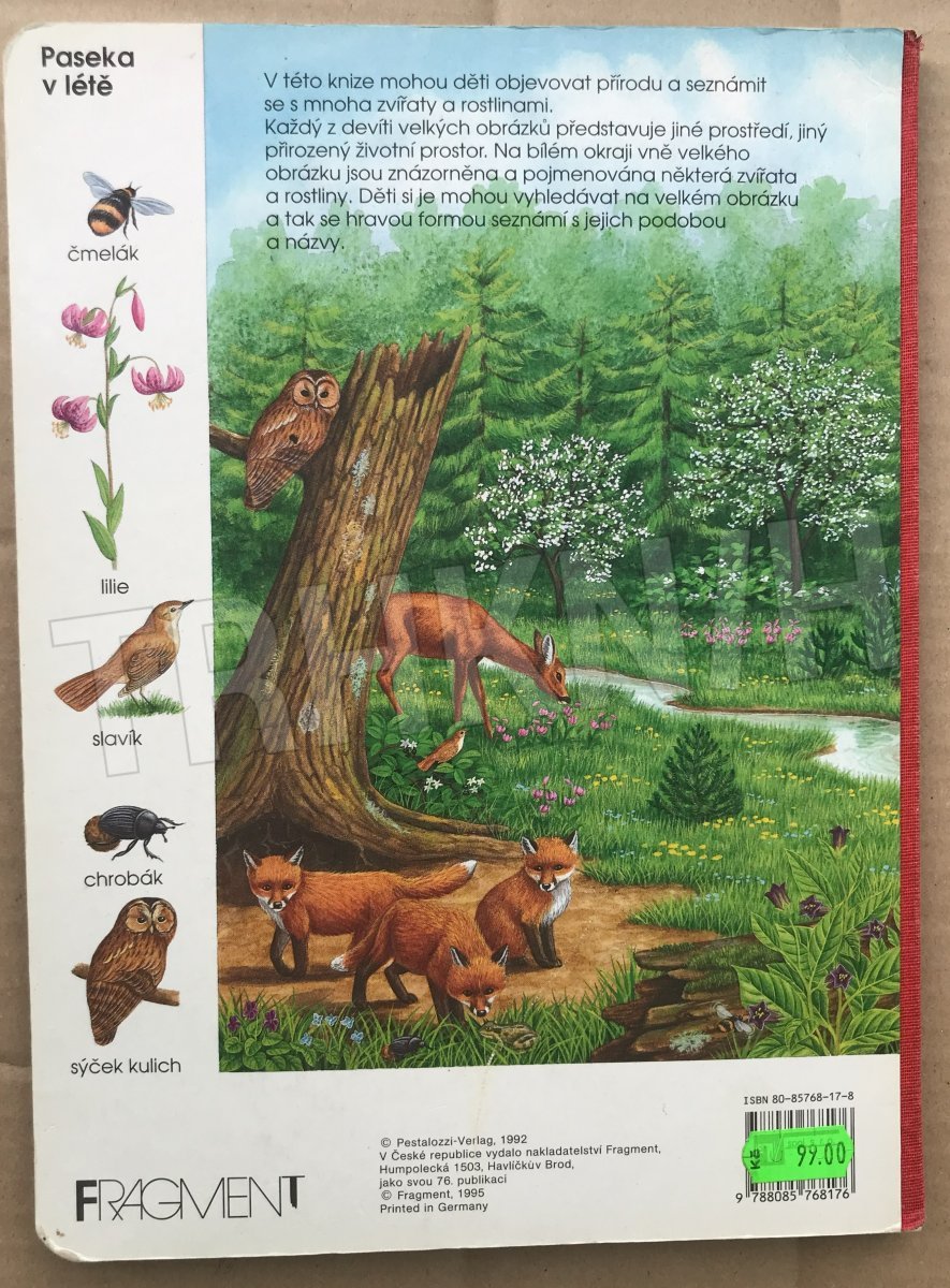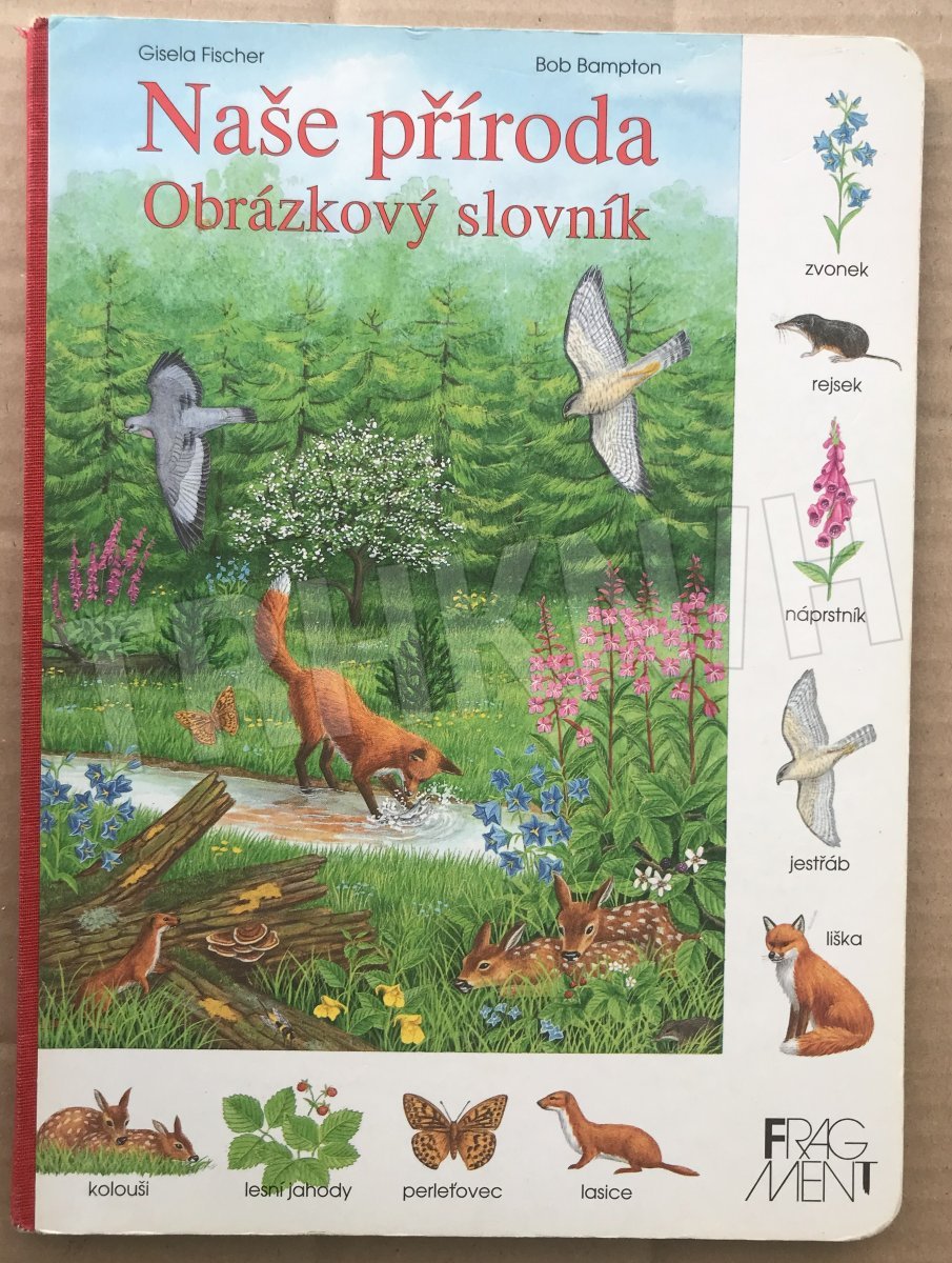 Obrázkový slovník-leporelo pro nejmenší děti. Dvoustránkové obrazové tabule zobrazují život v přírodě od jara do zimy. V bílém pásu na okraji tabule se opakují ilustrace zvířat a rostlin s uvedením jejich názvu, které děti mohou v obrázku vyhledávat a pojmenovávat.