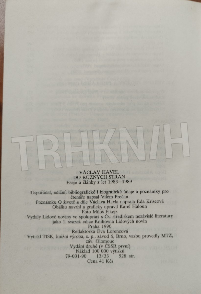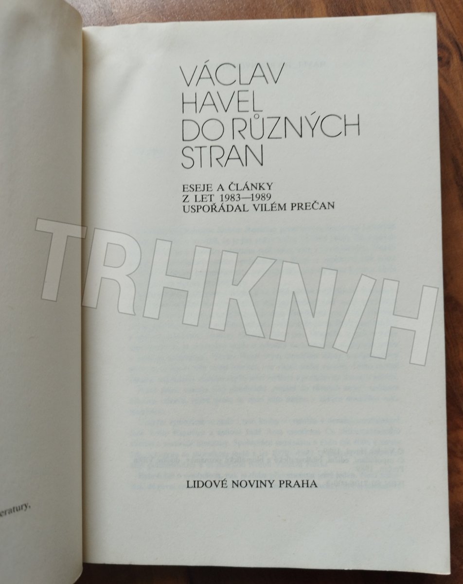 Do různých stran: eseje a články z let 1983–1989 / Václav Havel Lidové noviny : Československé středisko nezávislé literatury, 1990 (Knihovna Lidových novin ; sv. 1) Poznámku O životě a díle Václava Havla napsala Eda Kriseová Chronologický přehled o životě a díle V. Havla Bibliografie díla V. Havla na s. 475–488 Prečan, Vilém, 1933– * disent -- Československo * česká literatura -- 1968-1989 * divadlo -- Československo * kultura a společnost -- Československo * Československo -- politika a vláda -- 1968-1989 * eseje * články