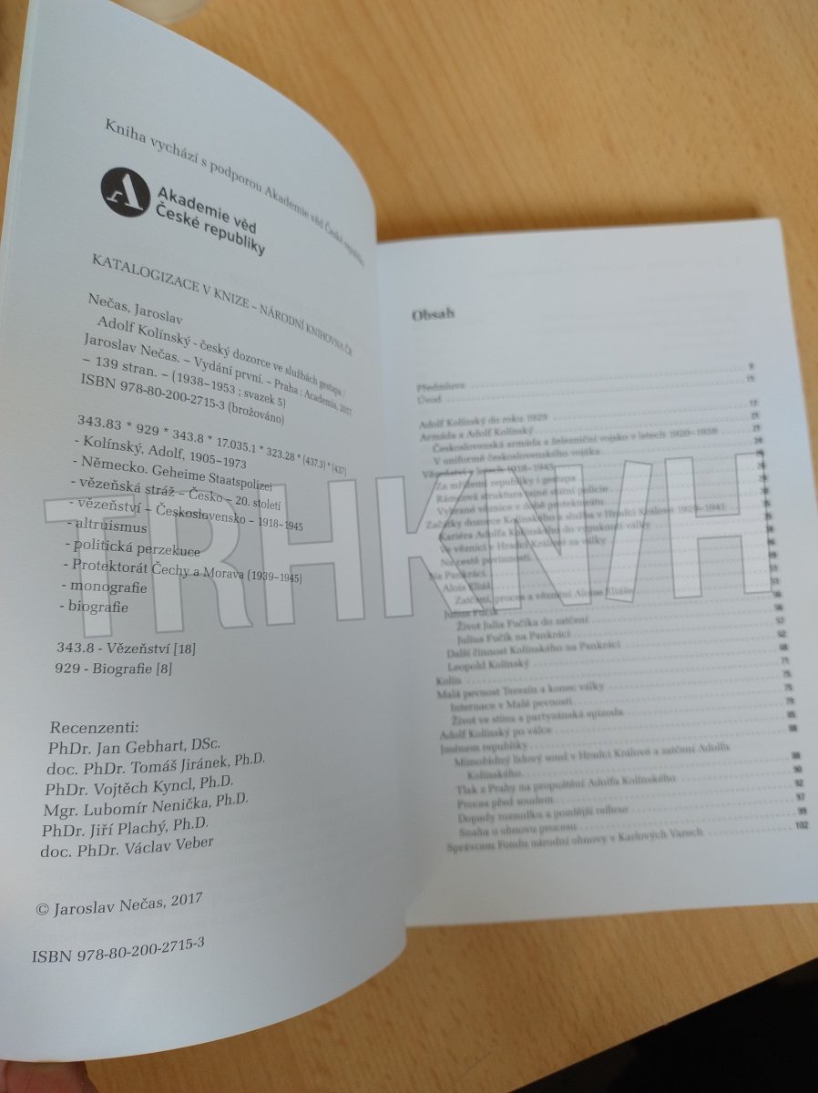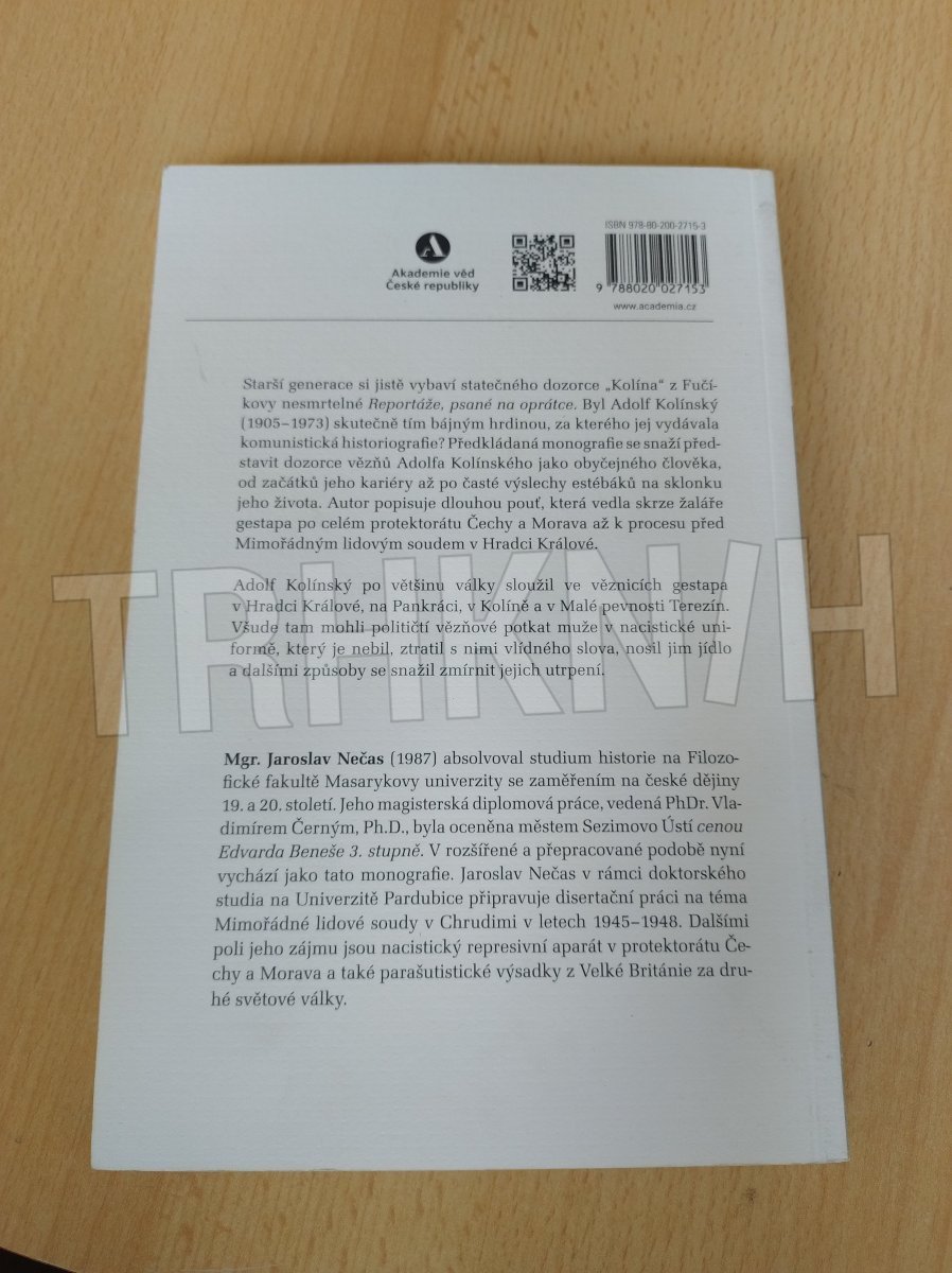 Starší generace si jistě vybaví statečného dozorce „Kolína“ z Fučíkovy nesmrtelné knihy Reportáž psaná na oprátce. Byl Adolf Kolínský (1905–1973) skutečně tím bájným hrdinou, za kterého jej vydávala komunistická historiografie? Předkládaná monografie se snaží představit dozorce vězňů Adolfa Kolínského jako obyčejného člověka od začátků jeho kariéry až po časté výslechy příslušníků StB na sklonku jeho života. Autor popisuje dlouhou pouť, která vedla skrze žaláře gestapa po celém protektorátu Čechy a Morava až k procesu před Mimořádným lidovým soudem v Hradci Králové.