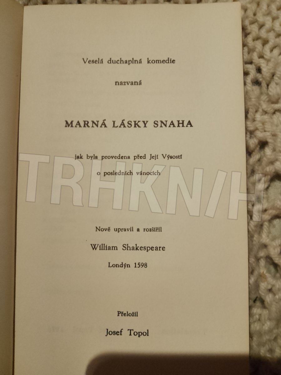 nově upravil a rozšířil William Shakespeare, Londýn 1598 ; přeložil Josef Topol