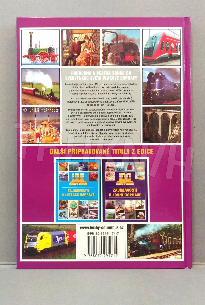 Železnice je široký pojem. Může znamenat jak kodrcání lokálkou k babičce do Benešova, tak jízdu nejdokonalejším a nejrychlejším japonským rychlovlakem. Může znamenat triumfy a prvenství, ale i neštěstí, nezdary a katastrofy. A o tom všem (a pochopitelně i o spoustě dalších věcí) pojednává tato encyklopedická publikace, zařazená do stále oblíbenější řady 100 nej… Projedeme se v ní úzkokolejkami i nejmodernějšími tratěmi světa a seznámíme se s mnoha zajímavostmi, o kterých jsme dosud neměli ani tušení. Začít můžeme klidně první koněspřežnou železnicí, pokračovat třeba slavným Orient expresem a skončit vagony plnými byznysmenů a internetových připojení. Tahle kniha je zkrátka pro každého, komu učaroval svět pražců, návěstidel a lokomotiv, od školního věku až po důchodce, a kromě zajímavého textu v ní naleznete i vynikající ilustrace.