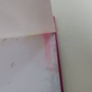 Stav knihy: Spodní část papírového přebalu je z obou stran lehce zabarvená od červené vazby (látkové desky) knihy, spodní hrana desek nese stopy navlhnutí (květina nad knihovnou), barva z červených desek mírně pustila, rozpila se a zvlnila přebal knihy a