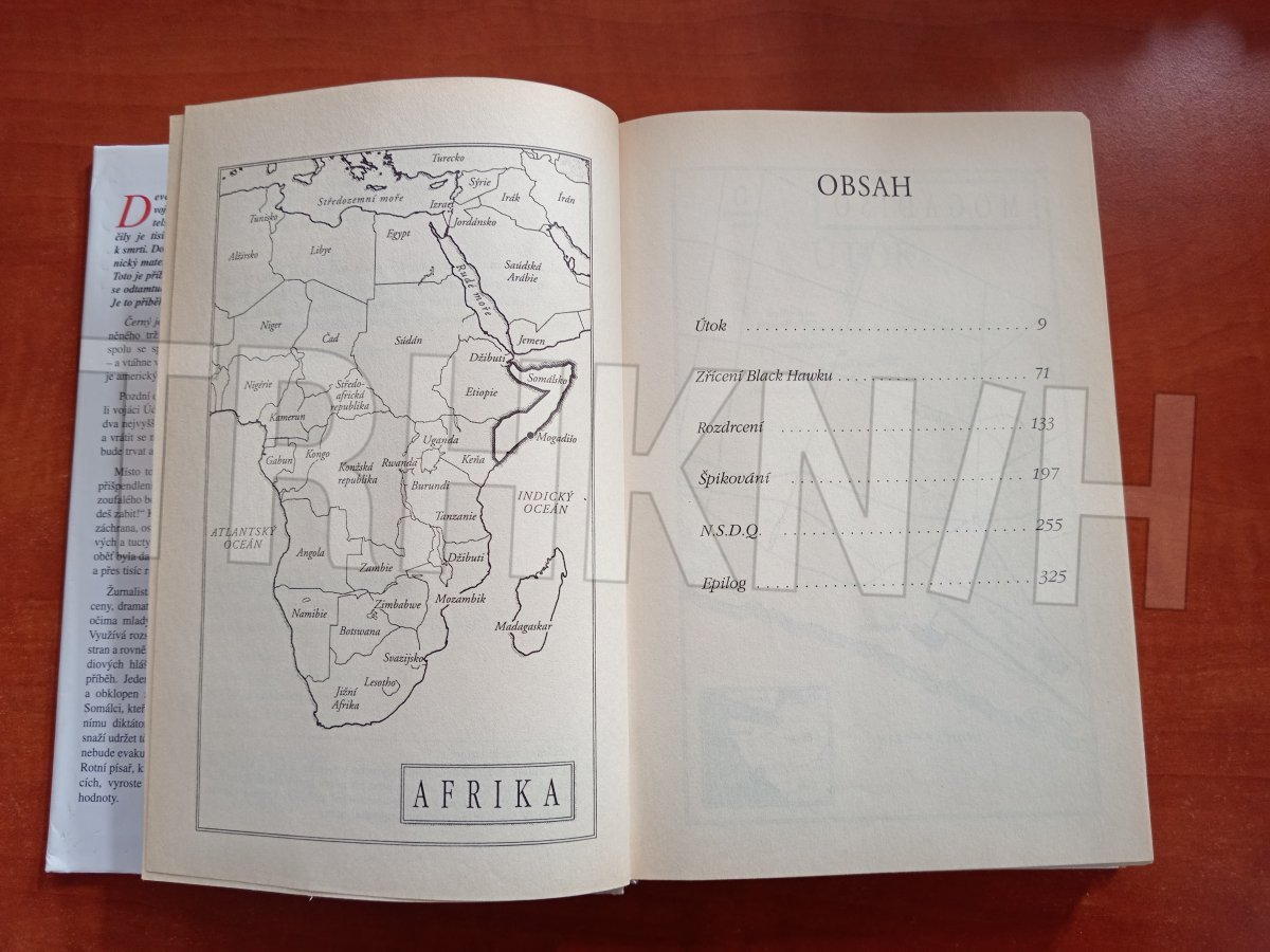 Žurnalista Mark Bowden zachycuje dramatický i drastický osud mladých mužů ze speciálních jednotek americké armády, kteří byli vysláni, aby zatkli dva nejvyšší pobočníky zrádcovského diktátora. Všichni předpokládali, že to bude hladká záležitost a že se brzy vrátí na základnu v somálském Mogadišo. Místo toho padli do pasti a byli obklíčeni v nepřátelském městě. Ocitli se uprostřed zoufalého boje a museli přečkat hrůzostrašnou noc. Když ráno příšla záchrana, bylo osmnáct vojáků mrtvých a mnoho dalších zraněných. Tato kniha vás svou naturální drsností a svým spádem strhne tak, že ji přečtete jedním dechem. Kdo viděl film, který byl podle ní natočen, oživí a prohloubí si svůj dojem z příběhu moderní války.