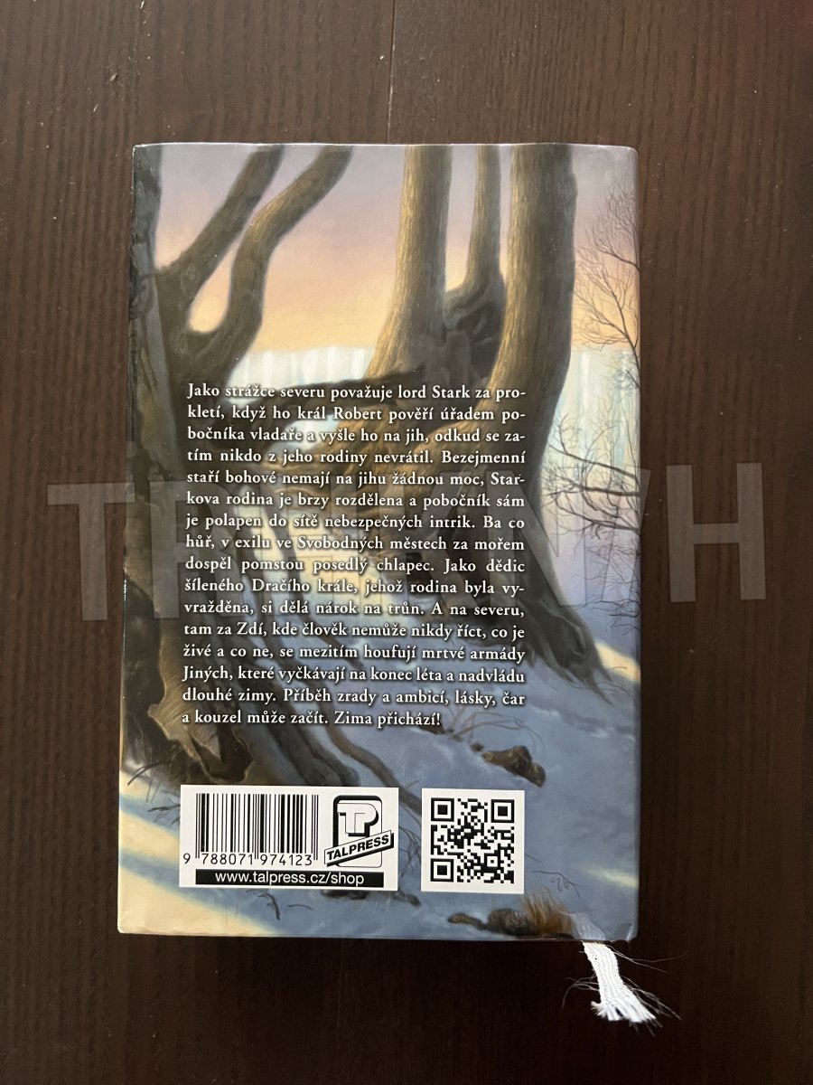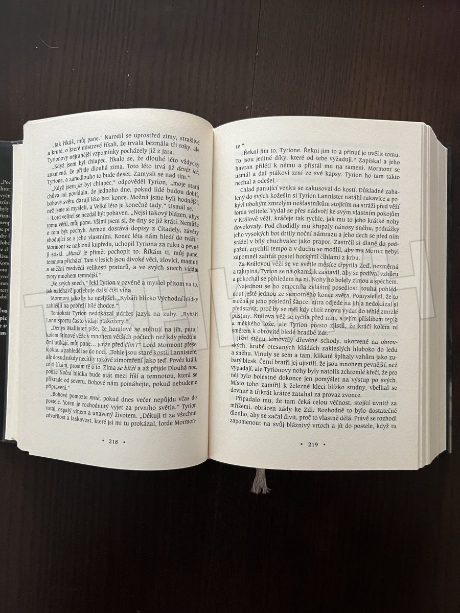 Dobrodružný román Hra o trůny autora George R. R. Martina poprvé v uceleném vydání. „Pod každým prstem měl čepel, hroty pokroucených mečů vyčnívajících jako tesáky z opěrek trůnu. Dokonce i po třech staletích byly některé ostré tak, že dokázaly říznout. Železný trůn byl pro neopatrného plný pastí. V písních se pravilo, že bylo třeba tisíce mečů, aby ho vyrobili, rozžhavených doběla ve výhni plamenů dštících ze chřtánu Baleriona Černého děsu. Kovali jej padesát devět dní. Konec jejich snažení korunovalo toto pokroucené černé monstrum vyrobené z jako břitva ostrých hran, hrotů a pásů kovu; trůn, který mohl zabít člověka, a také zabil, pokud lze věřit příběhům."