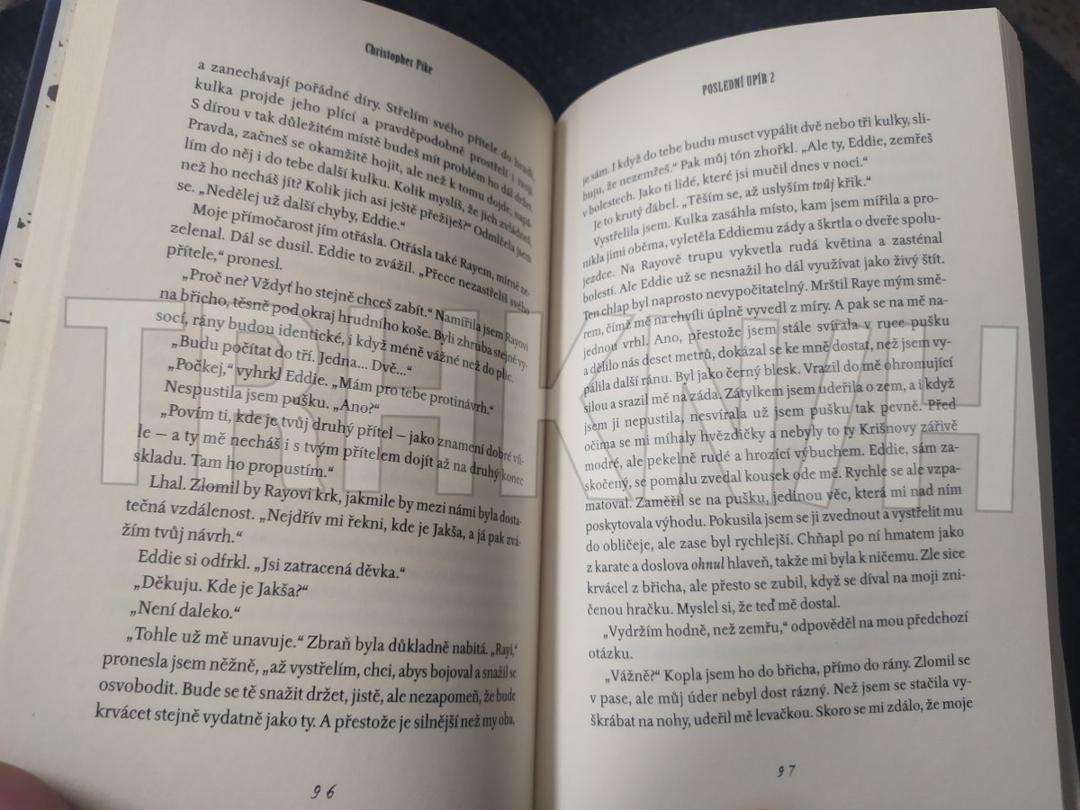 Triller Poslední upír 2 napsal Christopher Pike. Upíři nemusejí vypadat děsivě. Síta je na první pohled obyčejná teenagerka, která se od svých vrstevnic liší snad jen neobyčejnou krásou a inteligencí. Málokdo ví, že už je jí pět tisíc let a že je posledním žijícím upírem... Ve druhém díle slavného vampyristického cyklu se upírka Síta ocitá v Los Angeles, kde řádí obávaný gang. Síta zjistí, že šéf gangu má podobné schopnosti jako ona. Všechno nasvědčuje tomu, že se do hry vrátil muž, který měl být už mrtvý – obávaný a neporazitelný Jakša, jenž ze Síty před dávnými časy udělal upíra a nikdy si nepřestal činit nárok na její přízeň.