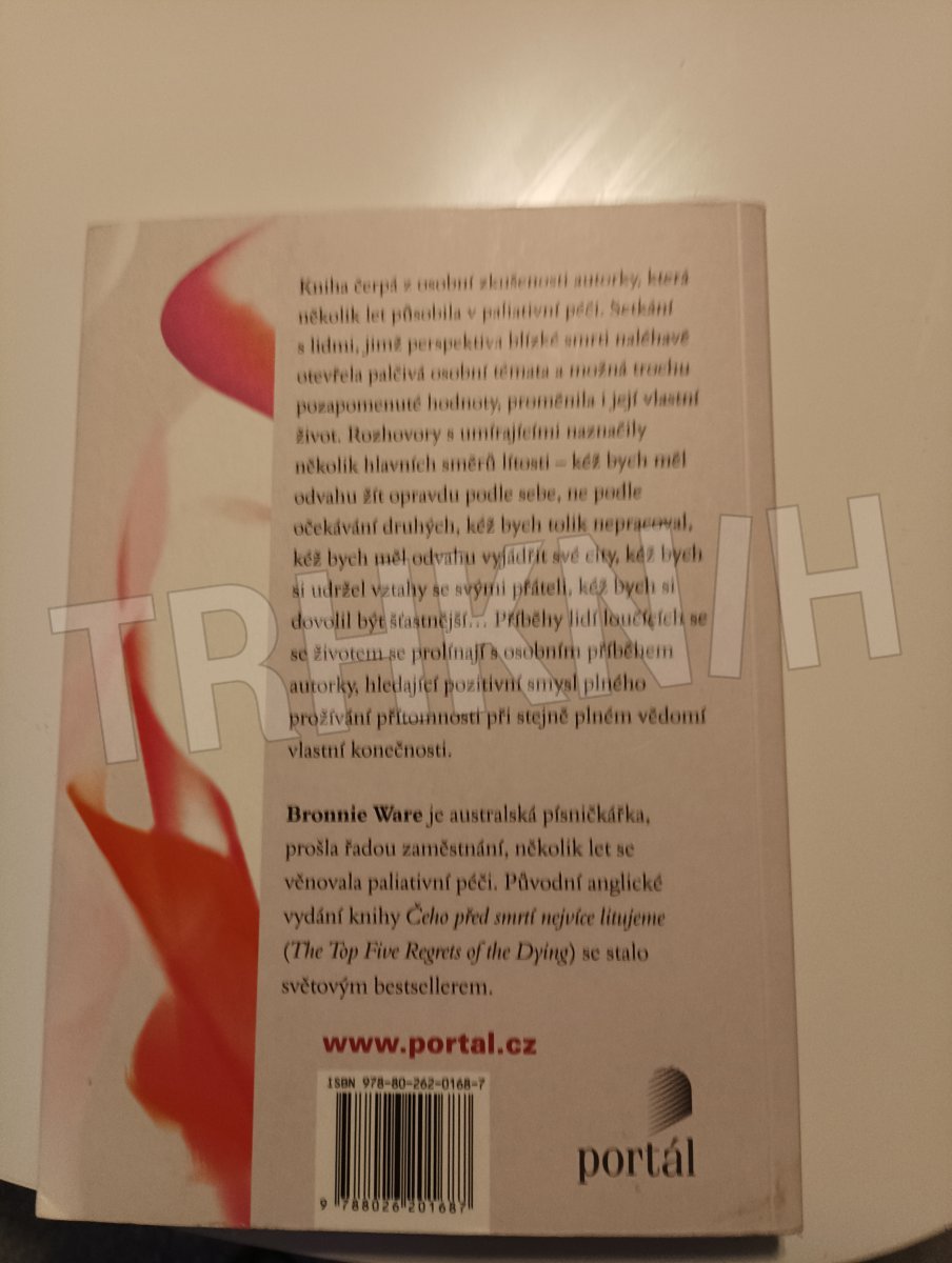 Kniha čerpá z osobní zkušenosti autorky, která několik let působila v paliativní péči. Setkání s lidmi, jimž perspektiva blízké smrti naléhavě otevřela palčivá osobní témata a možná trochu pozapomenuté hodnoty, proměnila i její vlastní život. Rozhovory s umírajícími naznačily několik hlavních směrů lítosti – kéž bych měl odvahu žít opravdu podle sebe, ne podle očekávání druhých, kéž bych tolik nepracoval, kéž bych měl odvahu vyjádřit své city, kéž bych si udržel vztahy se svými přáteli, kéž bych si dovolil být šťastnější… Příběhy lidí loučících se se životem se prolínají s osobním příběhem autorky, hledající pozitivní smysl plného prožívání přítomnosti při stejně plném vědomí vlastní konečnosti. Bronnie Ware je australskou písničkářkou, prošla řadou zaměstnání, několik let se věnovala paliativní péči. Původní anglické vydání knihy Čeho před smrtí nejvíce litujeme (The Top Five Regrets of the Dying) se stalo světovým bestsellerem.