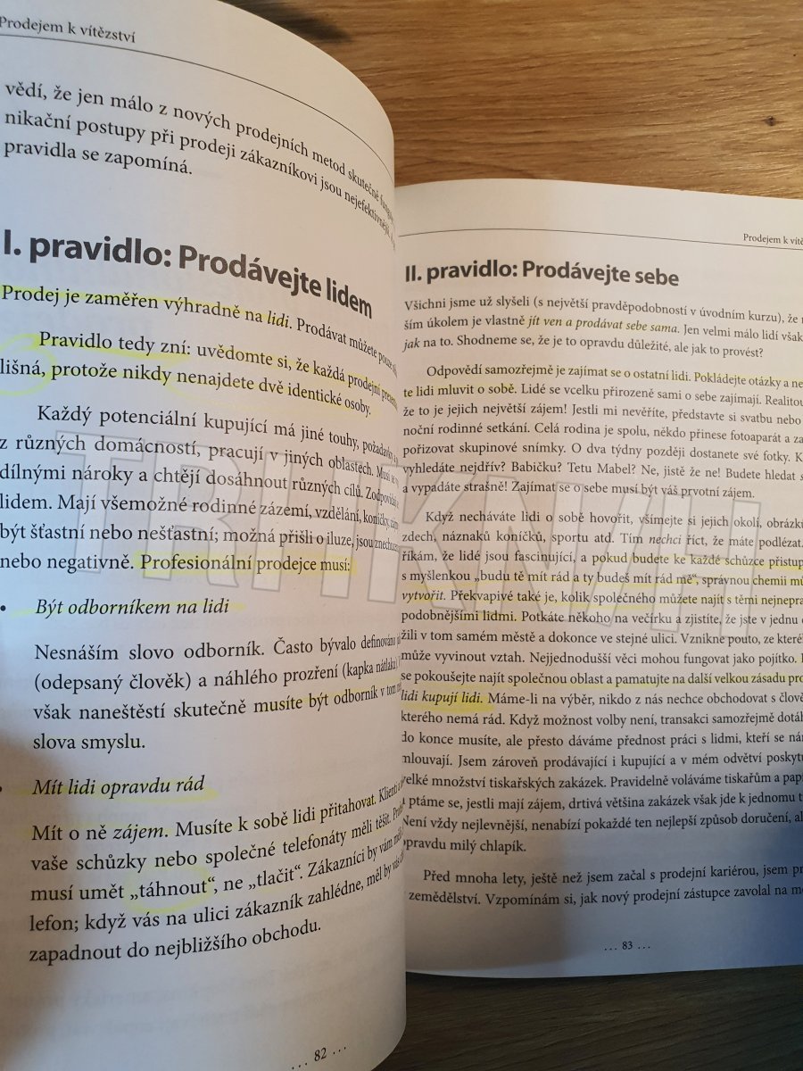 Pokud si chcete začít budovat kariéru jako úspěšný prodejce nebo už profesionálním prodejcem jste a rádi byste své prodeje navýšili, kniha Prodejem k vítězství se vám jistě stane neocenitelnou příručkou. Nemůže vás sice naučit znalosti produktu, který prodáváte, co vás však naučit může, je schopnost přesvědčit stávající či potenciální zákazníky, aby obchod s vámi uzavřeli. Autor vysvětluje přímým a čtivým způsobem použití nejlepších prodejních technik v praxi. Využívá přístup, který se ve většině případů zakládá na zdravém rozumu, je věcný, profesionální a odvíjí se od toho, jak by si naši zákazníci přáli, aby jim bylo prodáváno. Třetí vydání této knihy, jehož překlad si právě prohlížíte, vám poskytne neocenitelné rady, jak: prodat, přestože nejste nejlevnější, vybudovat si a udržet pozitivní přístup, porazit konkurenci, uzavřít obchod, udělat ze zákazníka svého spojence, který vás bude doporučovat. Autor říká, že měl v úmyslu napsat knihu, kterou lidé skutečně přečtou od první do poslední stránky, ale zároveň v ní budou moci pouze dohledávat. Můžete sami posoudit, zda se mu podařilo tento úmysl naplnit. Při čtení ani samotném prodávání ale nezapomínejte, že „dobrý prodejce dokáže prodat cokoli, pouze jestliže v to věří“.