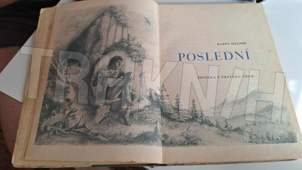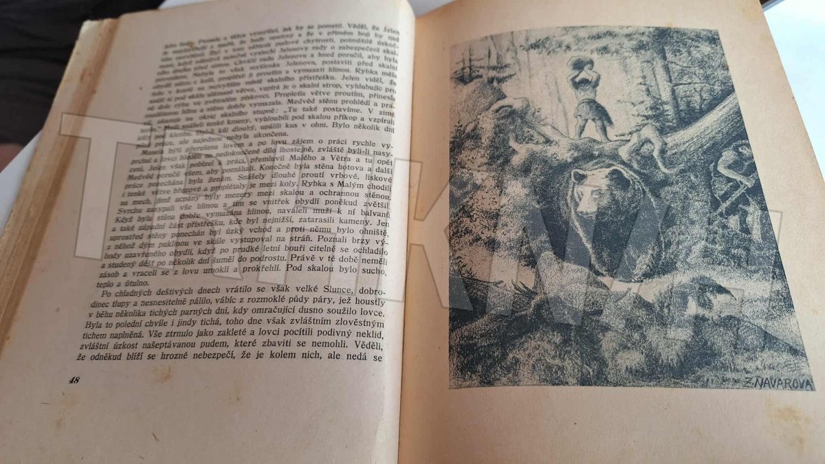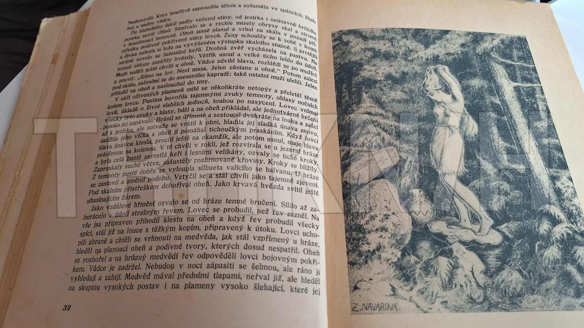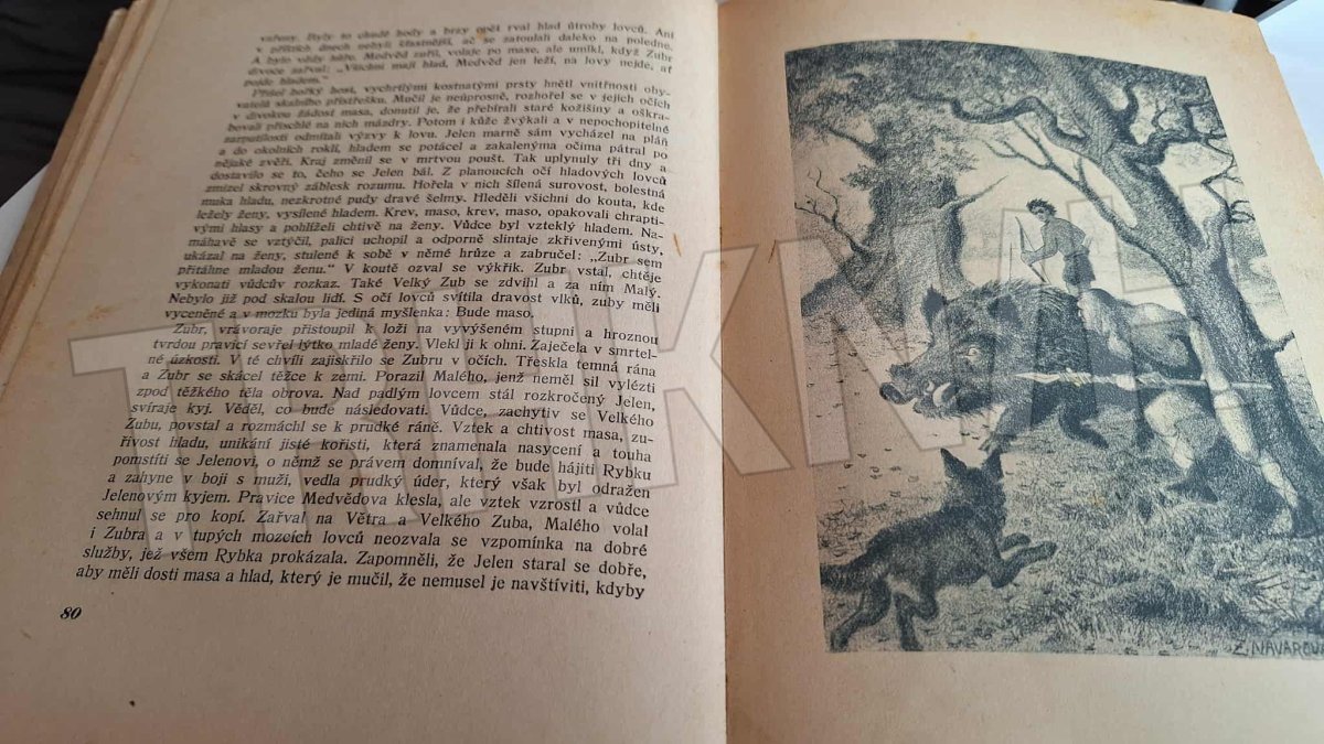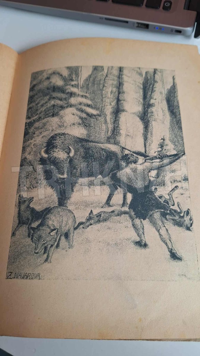 Stará kniha, příběh z pravěku s nádhernými ilustracemi. Nakl.Cíl 1945. Vazba poškozená, stránky s flíčky, známky užívání ( viz foto ).