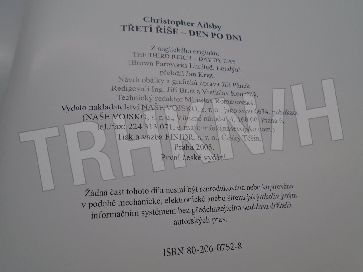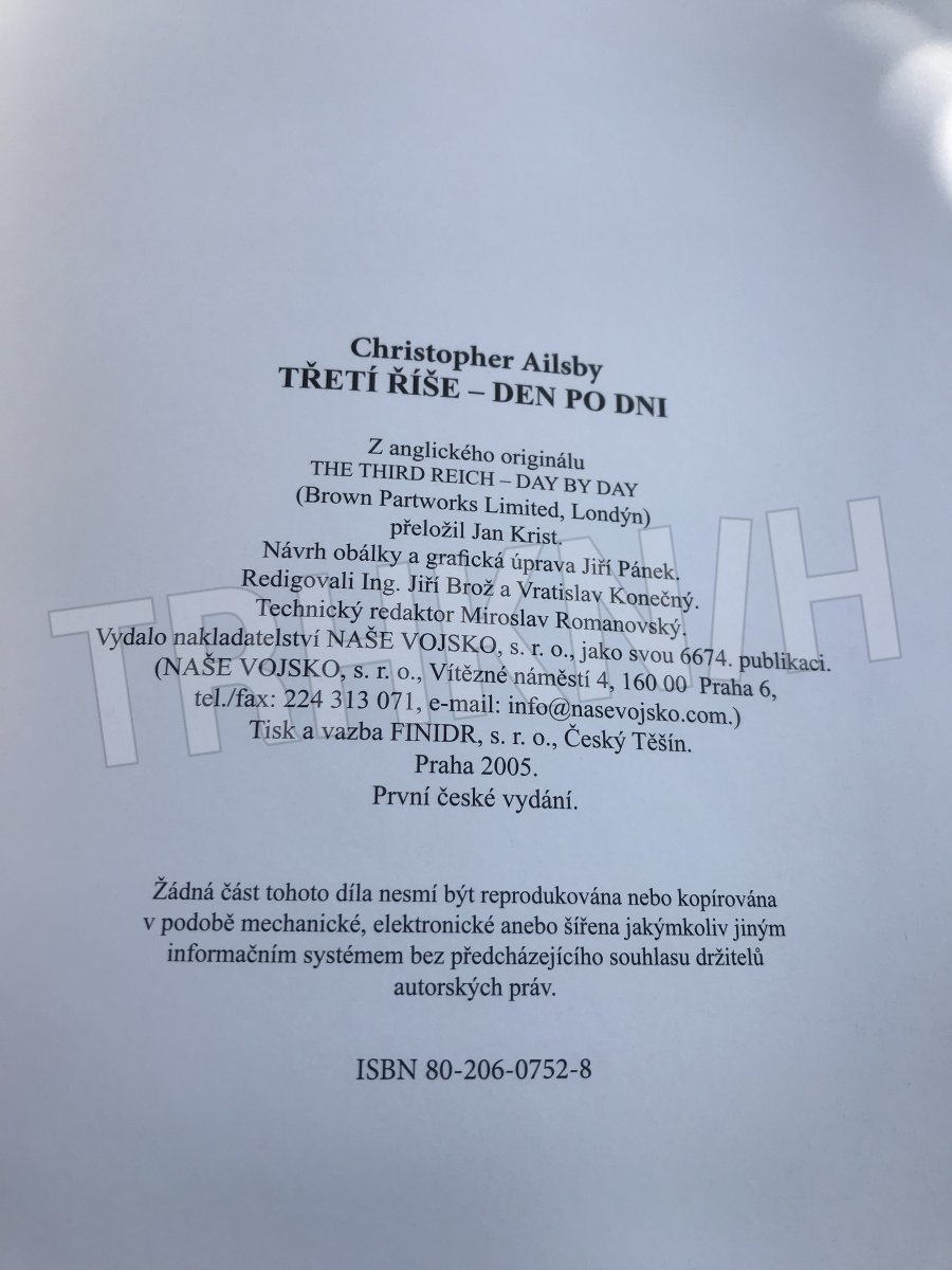 Třetí říše : den po dni Autor: Ailsby, Christopher Vydání: 1 Místo vydání: Praha Počet stran: 189 s. Rok vydání: 2005 Vazba: vázaná Stav: dobrý Nakladatel: Naše vojsko Kategorie: Válečné knihy Edice, série: kniha Vytvořeno: 2020-02-18 14:12:19 Naposledy
