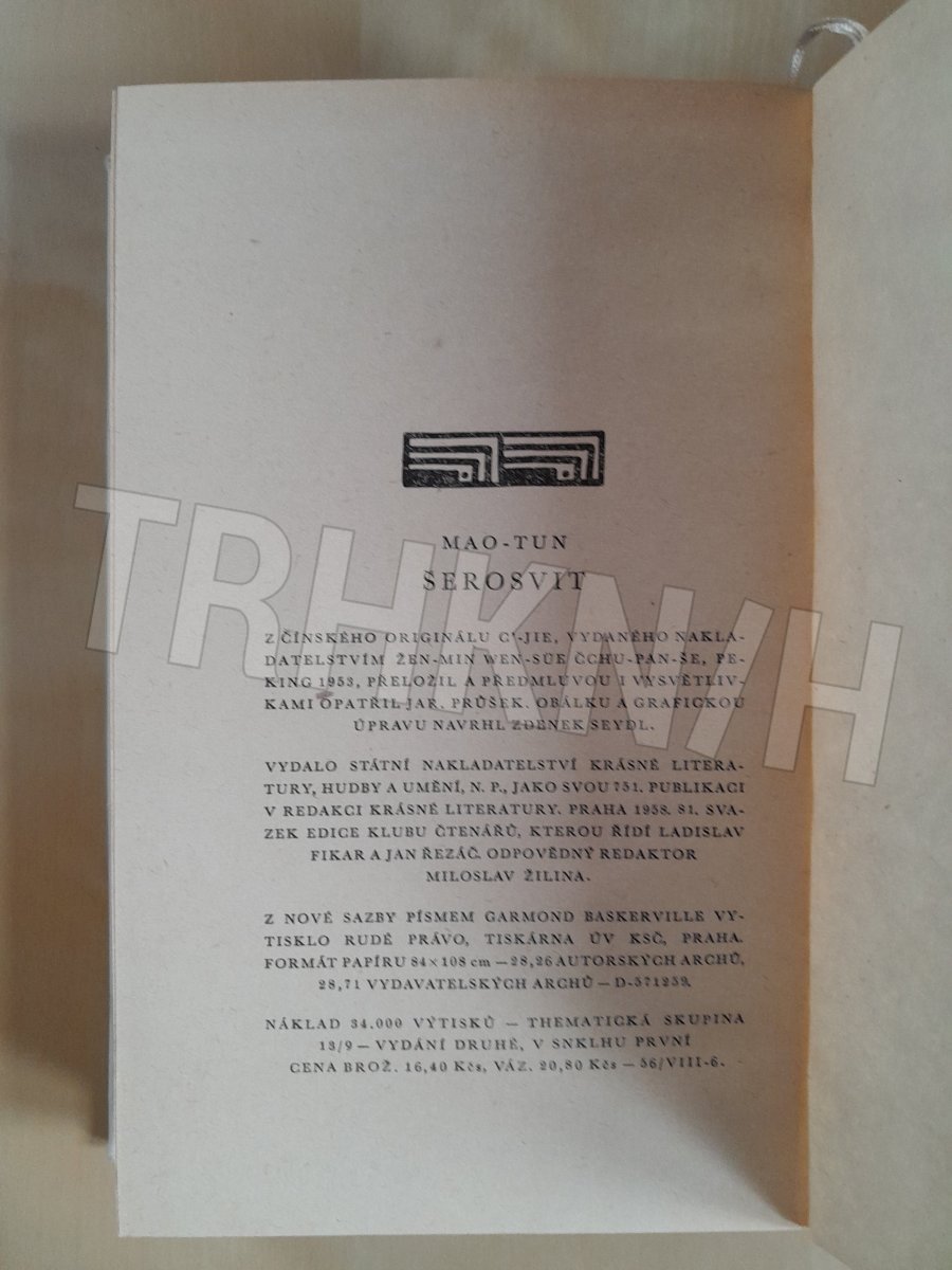 Mao-tun: ŠEROSVIT /přelož. Jaroslav Průšek, SNKLHU 1958/ a