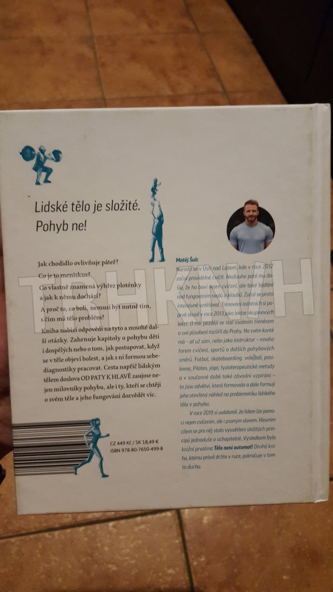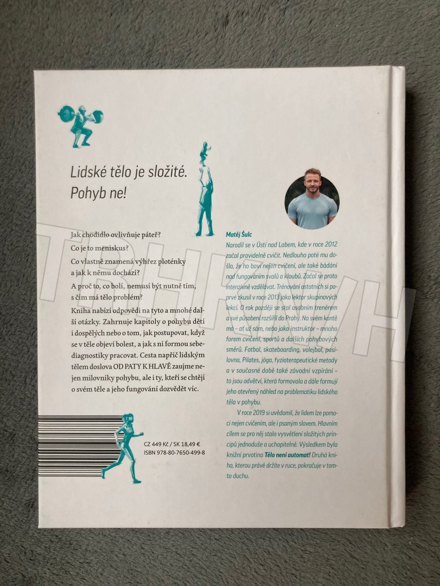 Jak chodidlo ovlivňuje páteř? Co je to meniskus? Co znamená výhřez ploténky a jak k němu dochází? A proč to, co bolí, nemusí nutně být to, s čím má tělo problém? Kniha nabízí odpovědi na tyto a další otázky. Zahrnuje i kapitoly o pohybu dětí i dospělých nebo o tom, jak postupovat, když se objeví bolest. Cesta napříč lidským tělem pohledem Matěje Šulce lektora cvičebních kurzů a trenéra v jedné osobě zaujme nejen milovníky pohybu, kteří se chtějí o svém těle dozvědět víc. Publikace vysvětluje frincipy fungování lidského těla. Zahrnuje i kapitoly o pohybu dětí i dospělých nebo o tom, jak postupovat, když se v těle objeví bolest, a jak s ní formou sebediagnostiky pracovat.