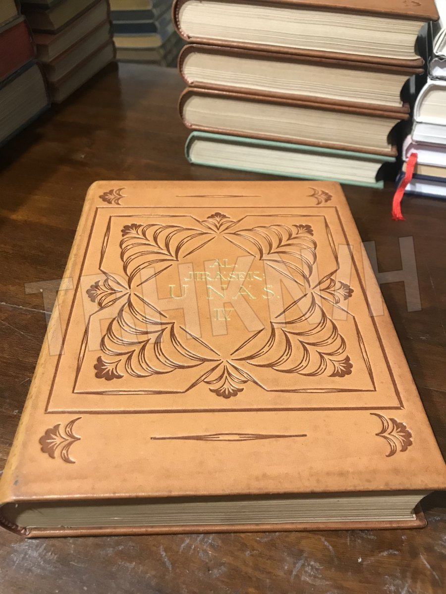 Celokožená krásná vazba s pozlaceným písmem a zdobená reliéfy
