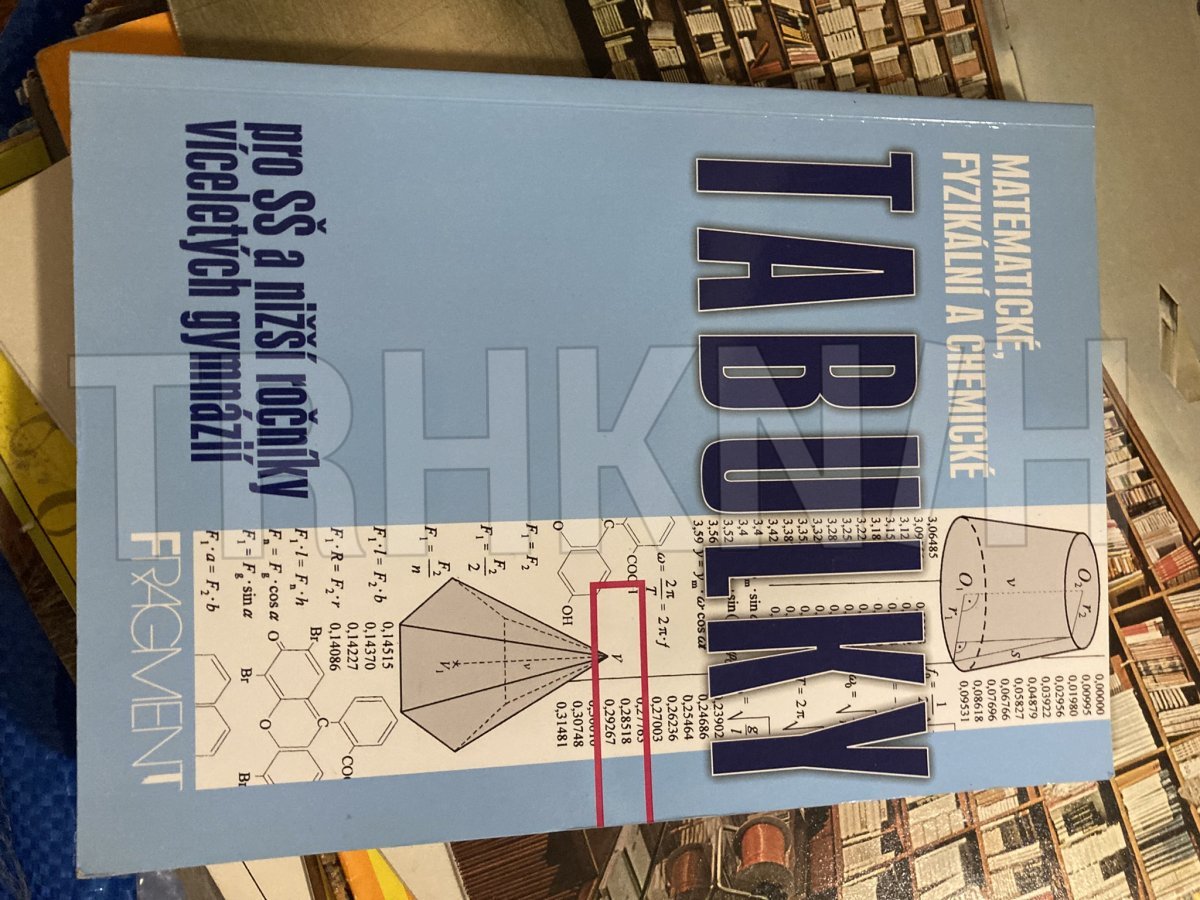 kniha má mírně roztřepené rohy obálky, na první vnitřní straně je podepsaná, uvnitř jsou dopsané vzorce pro mocniny a odmocniny reálných čísel a logaritmy.