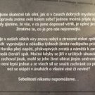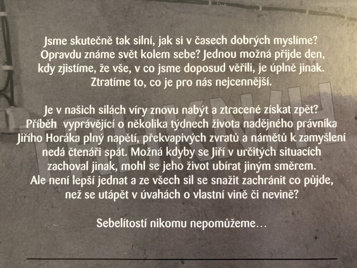 Příběh vyprávějící o několika týdnech života nadějného právníka Jiřího Horáka plný napětí, překvapivých zvratů a námětů k zamyšlení nedá čtenáři spát. Možná kdyby se Jiří v určitých situacích zachoval jinak, mohl se jeho život ubírat jiným směrem. Ale není lepší jednat a ze všech sil se snažit zachránit co půjde, než se utápět v úvahách o vlastní vině či nevině? Sebelítostí nikomu nepomůžeme…