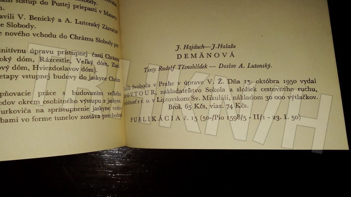 Barevné fotografie podzemního bludiště v demänovských krápníkových jeskyních doprovázené básnickým slovem jednoho z největších propagátorů Demänové R. Těsnohlídka, který se zúčastnil po čtyři roky objevných prací v D. a své dojmy z výprav a sestupů do nitra země zachytil v mnoha článcích, fejetonech a causeriích.