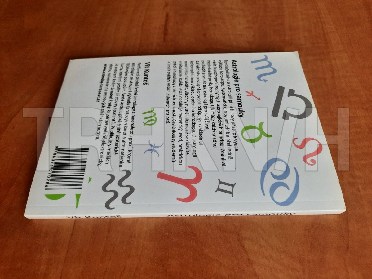 Astrologie pro samouky – Praktická učebnice výkladu horoskopu pro každého - Vít Kuntoš . Revoluční kniha o astrologii přináší nový přístup k výuce výkladu horoskopu. Systematicky, srozumitelně a přehledně vede k pochopení nezbytných astrologických principů. Zdánlivě nepřehledné prvky horoskopu tak může každý snadno pochopit a využít tak astrologii pro svůj život. 13 lekcí vás postupně provede od úplných základů až ke kompletnímu výkladu osobního horoskopu. O astrologii není třeba nic vědět, všechny nutné informace se dozvíte v této knize. Každá lekce obsahuje teoretický úvod, praktickou práci s horoskopy známých osobností, časté dotazy studentů a test k ověření vašich získaných znalostí. Vít Kuntoš Patří mezi přední české astrology s mnohaletou praxí. Kromě astrologie se věnuje i výkladu tarotových karet a alternativním léčebným postupům. Vede astrologické a jiné ezoterické kurzy, kterými prošly již stovky studentů. Publikuje v médiích. Je autorem knihy Snadné kroky ke zdraví vydané elektronicky, kterou naleznete na webových stránkách autora.