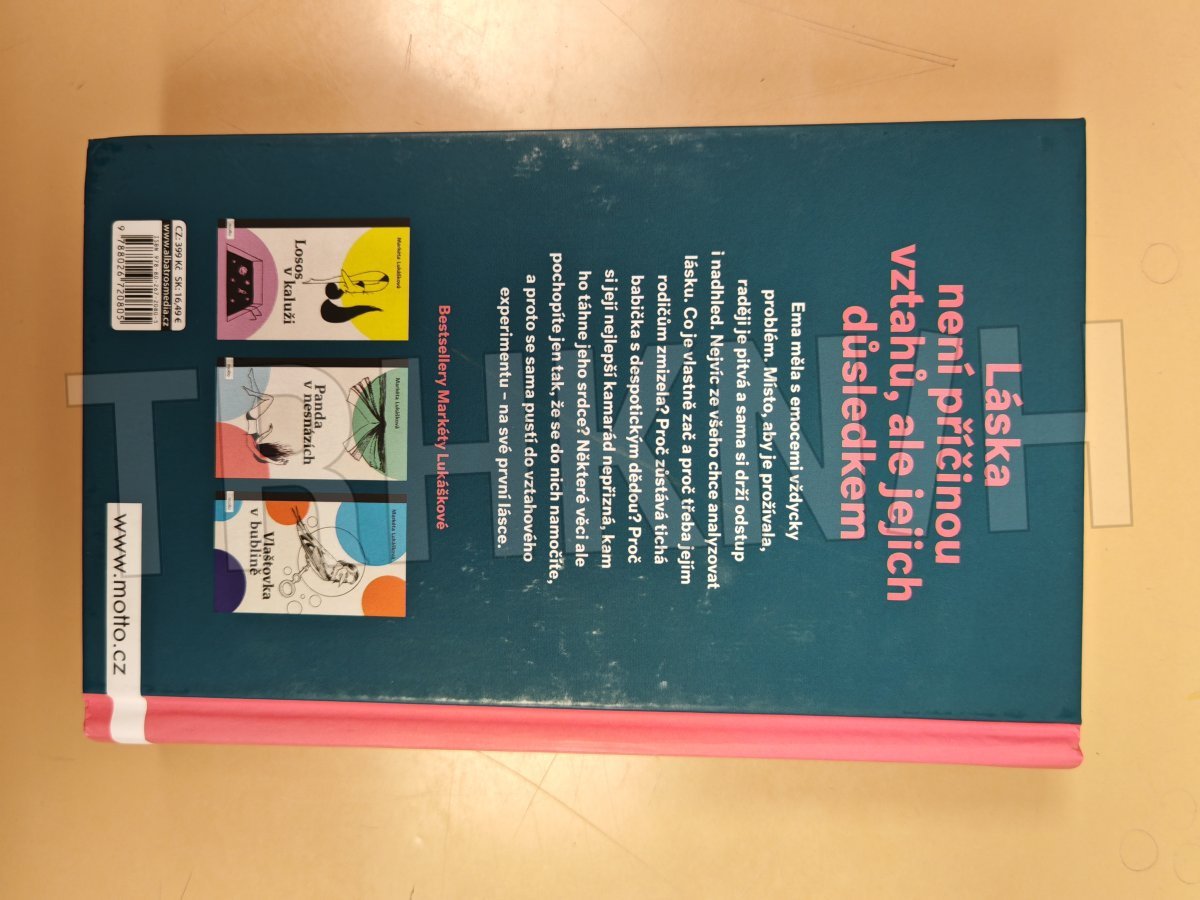 Láska není příčinou vztahů, ale jejich důsledkem Nový samostatný román Markéty Lukáškové. Se svou prvotinou Losos v kaluži objela republiku v rámci divadelního projektu Listování a napsala podle ní scénář, který nyní čeká na filmové zpracování. Po Lososovi následovaly knihy Panda v nesnázích, InTyMně a Vlaštovka v bublině. Skrze své tituly se Markéta snaží šířit osvětu o vnímání psychických problémů. Ema měla s emocemi vždycky problém. Místo, aby je prožívala, raději je pitvá a sama si drží odstup i nadhled. Nejvíc ze všeho chce analyzovat lásku. Co je vlastně zač a proč třeba jejím rodičům zmizela? Proč zůstává tichá babička s despotickým dědou? Proč si její nejlepší kamarád nepřizná, kam ho táhne jeho srdce? Některé věci ale pochopíte jen tak, že se do nich namočíte, a proto se sama pustí do vztahového experimentu – na své první lásce.