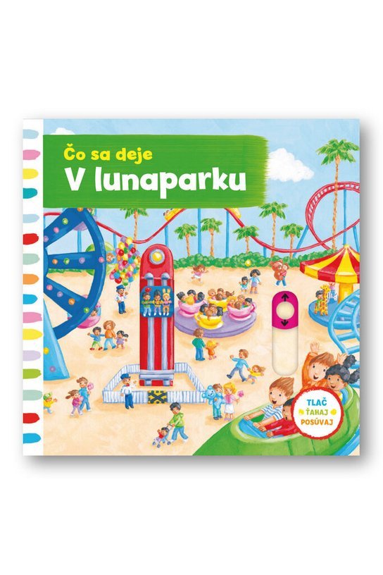 Zaujíma ťa, čo sa deje v zábavnom parku? Toto leporelo je určené pre deti od jedného roka. Má pevné stránky s posuvnými a otočnými prvkami, a tak si dieťa pri prezeraní knižky súčasne precvičí jemnú motoriku - môže na jednotlivých stránkach posúvať, ťahať, otáčať. Objaví nové veci a môžete sa o nich spoločne porozprávať!