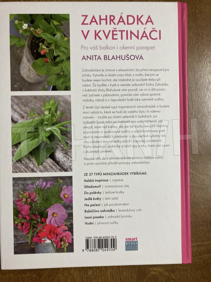 K vytvoření minizahrádky vám postačí balkon nebo okenní parapet! Kniha Zahrádka v květináči Anity Blahušové vám poradí na co si dát pozor, než začnete s pěstováním, pomůže vám vybrat správné nádoby, nářadí a také rostliny vhodné právě pro váš domov. Krok za krokem s vámi rostliny zasadí, zbývá už jen zvolit si ten pravý typ zahrádky. Ze 37 inspirativních minizahrádek si budete moci vybrat tu, která se hodí do vašeho bytu i k vašemu naturelu – toužíte po vlastní zelenině či bylinkách, po rozkvetlé louce nebo po květináči pro vaše nejmenší, jste alergik, máte rád květiny, ale jste tak trochu lenoch? Všechny popisované a vyobrazené rostliny a jejich kombinace patří mezi ty nejsnadnější k pěstování a jsou pečlivě vybrané tak, aby založení minizahrádky zvládl i naprostý začátečník. Kniha obsahuje i praktické a tvůrčí tipy a triky, které jistě ocení i letití zahrádkáři.