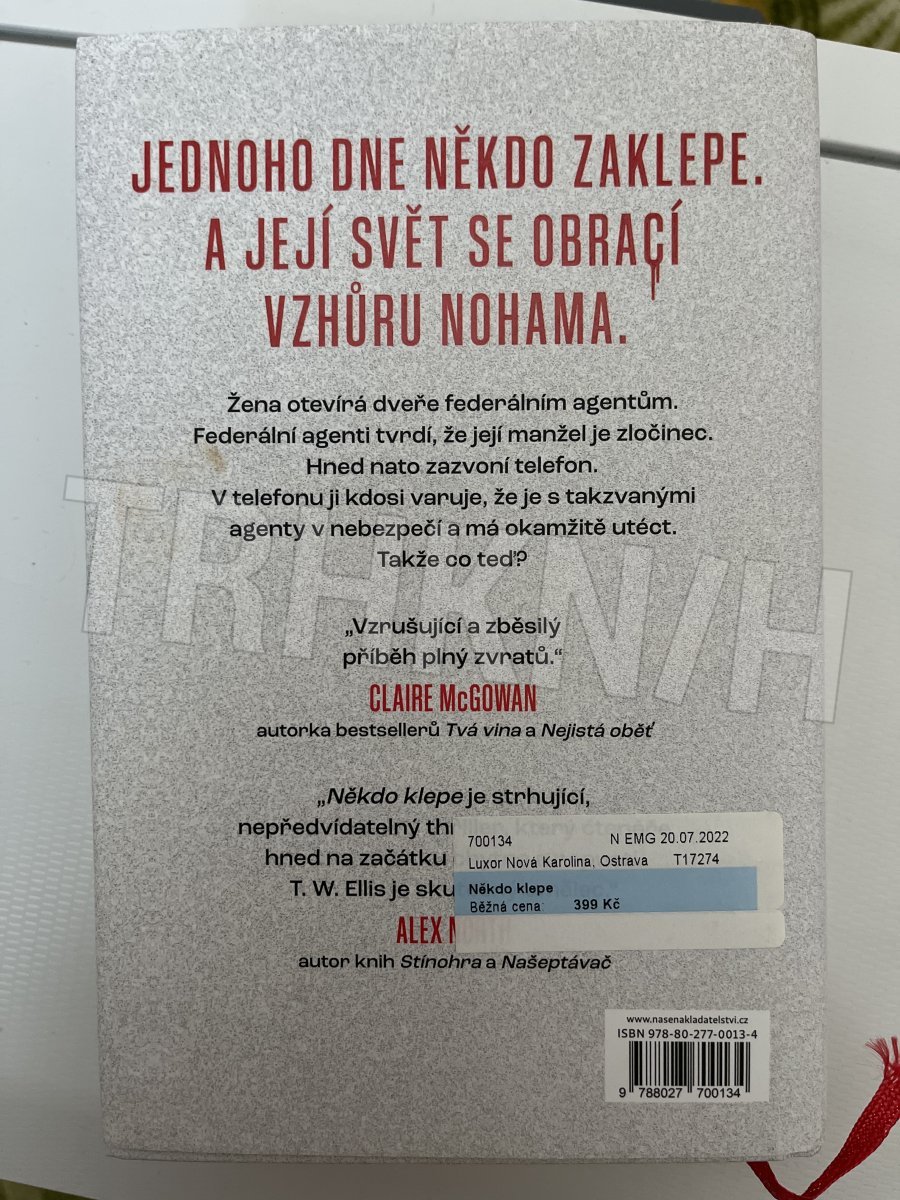 Brzy ráno vám někdo klepe na dveře. Lidé, kteří vypadají a chovají se jako federální agenti. Tvrdí, že váš manžel není tím, za koho se vydává, nýbrž pracuje pro kartel a pere špinavé peníze. Vyzvou vás, abyste jim věřili a odešli s nimi. Pak se však rozezní pevná linka. Kdo v dnešní době ještě používá pevnou linku? Neznámý muž na druhém konci vás nabádá, abyste těm lidem nevěřili. Abyste utekli. Jde vám o život. Komu uvěříte? Komu věřit můžete? V děsivém psychologickém thrilleru autora bestsellerů T. W. Ellise se osamělá žena musí dát na útěk, aby si zachránila život, a přitom musí pochybovat o všem, co kdy milovala.