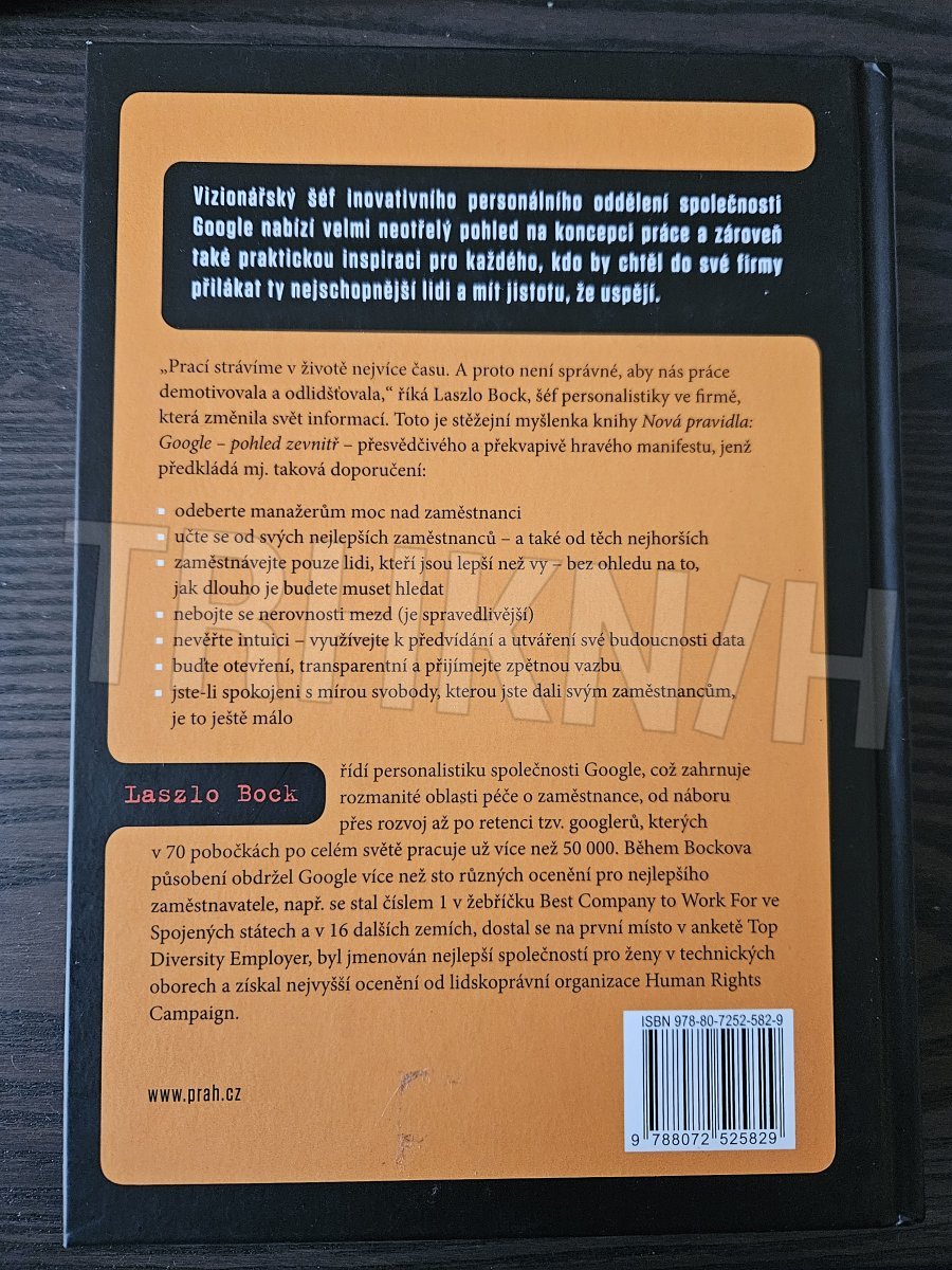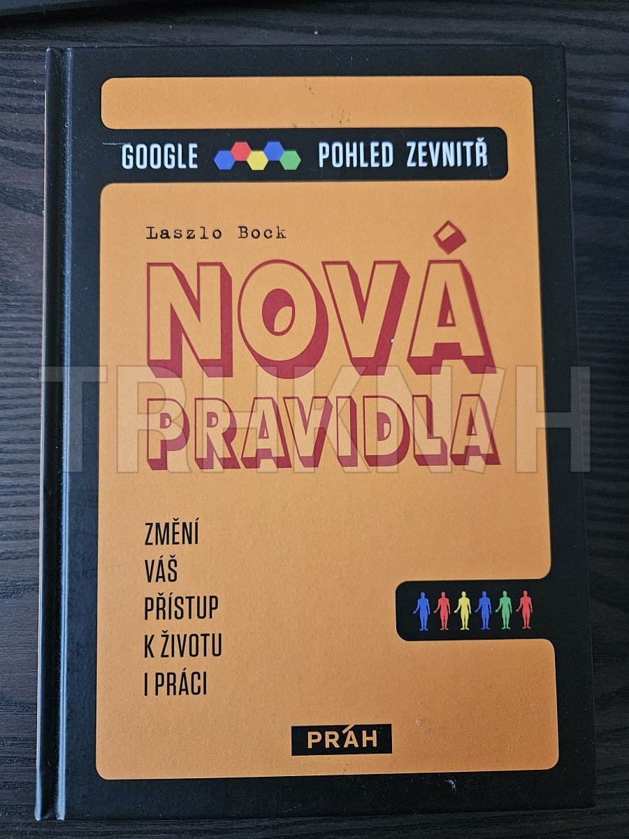 „Prací strávíme v životě nejvíce času. A proto není správné, aby nás práce demotivovala a odlidšťovala,“ říká Laszlo Bock, šéf personalistiky ve firmě, která změnila svět informací. Toto je stěžejní myšlenka knihy Nová pravidla: Google – pohled zevnitř – přesvědčivého a překvapivě hravého manifestu, jenž předkládá mj. taková doporučení: - odeberte manažerům moc nad zaměstnanci - učte se od svých nejlepších zaměstnanců – a také od těch nejhorších - zaměstnávejte pouze lidi, kteří jsou lepší než vy – bez ohledu na to, jak dlouho je budete muset hledat - nebojte se nerovnosti mezd (je spravedlivější) - nevěřte intuici – využívejte k předvídání a utváření své budoucnosti data - buďte otevření, transparentní a přijímejte zpětnou vazbu ad.