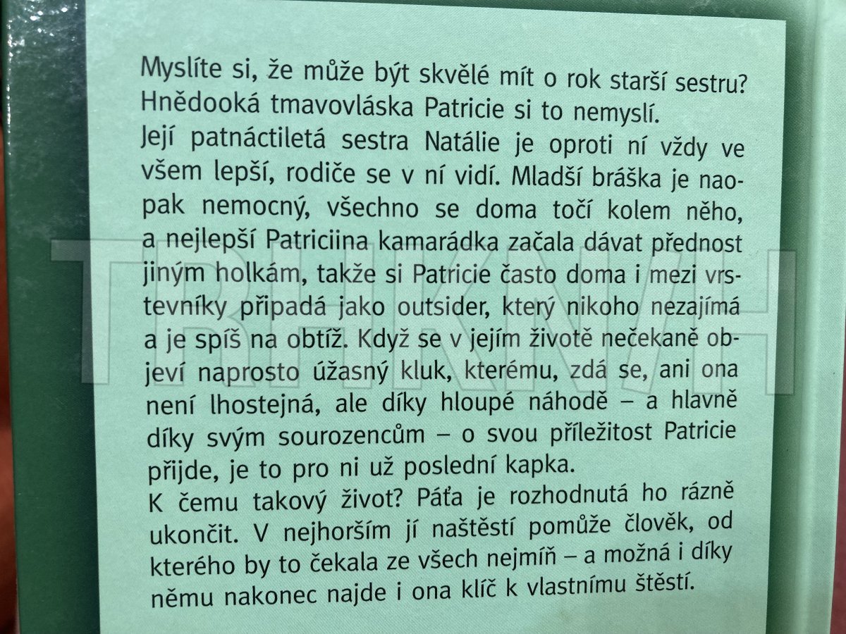 Doma se Patricie cítí odstrčená, rodiče se věnují jen jejímu mladšímu postiženému bratrovi, a ve všem preferují její starší sestru - gymnazistku. Ani ve škole se necítí dobře: její nejlepší kamarádka dala přednost třídní krasavici Viky. Navíc musí sedět v lavici s novou spolužačkou, podivínkou, která vypadá a chová se jako bytost z jiné planety. Všechno se ale má brzy změnit: v jejím životě se objeví naprosto úžasný kluk.