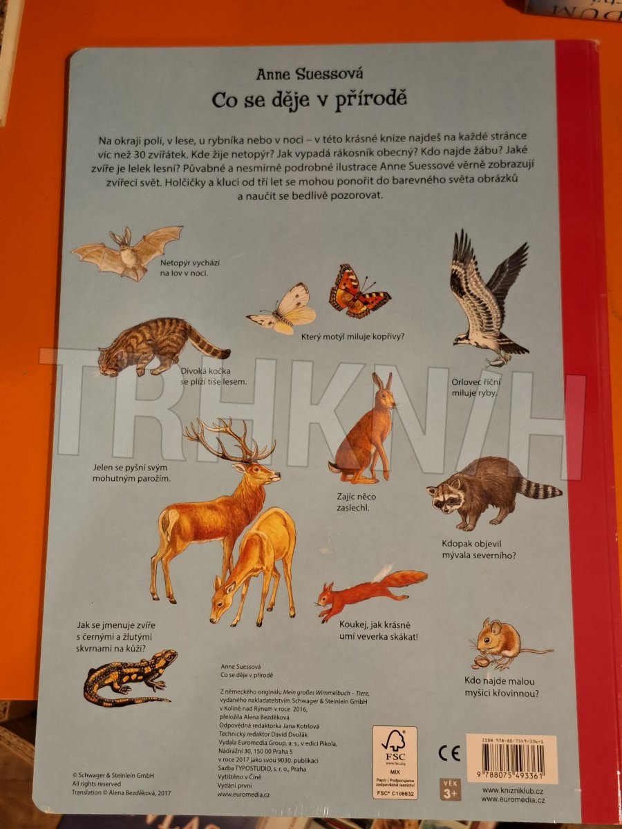 Na okraji polí, v lese, u rybníka nebo v noci – v této krásné knize najdeš na každé stránce víc než 30 zvířátek. Kde žije netopýr? Jak vypadá rákosník obecný? Kdo najde žábu? Jaké zvíře je lelek lesní? Půvabné a nesmírně podrobné ilustrace Anne Suessové věrně zobrazují zvířecí svět. Holčičky a kluci od tří let se mohou ponořit do barevného světa obrázků a naučit se přesně pozorovat.
