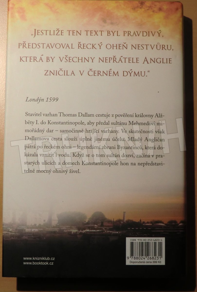 Londýn 1599. Stavitel varhan Thomas Dallam cestuje z pověření královny Alžběty I. do Konstantinopole, aby předal sultánu Mehmedovi mimořádný dar - samočinně hrající varhany. Ve skutečnosti však Dallamova cesta slouží úplně jinému účelu. Mladý Angličan pátrá po řeckém ohni - legendární zbrani Byzantinců, která dokázala vznítit i vodu. Když se o tom sultán dozví, začíná v prastarých ulicích a domech Konstantinopole hon na nepředstavitelně mocný ohnivý živel.