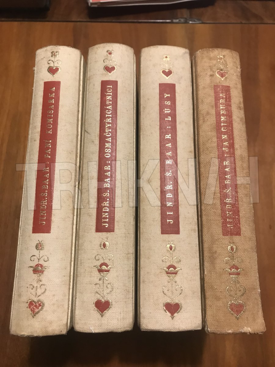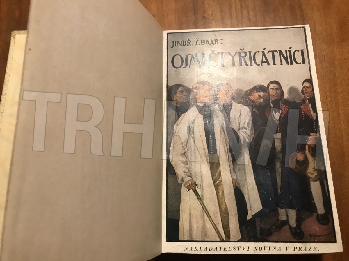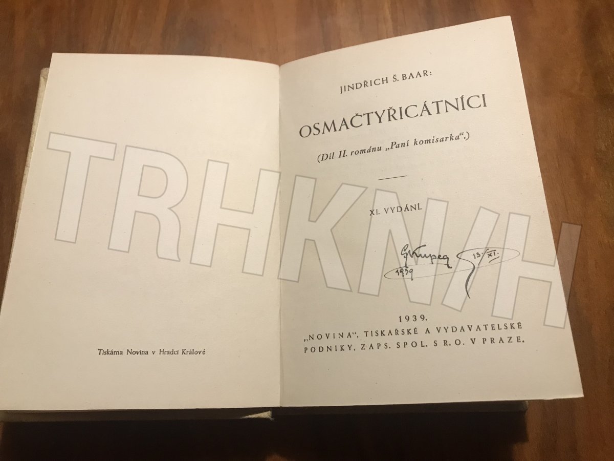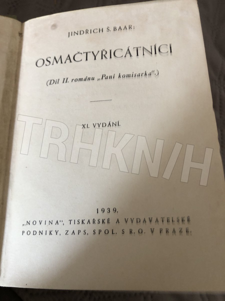 Za tuto cenu jsou 2 knihy - Osmačtyřicátníci, 1939, 11. vyd. + k tomu "Paní komisarka", 1939 ve 14. vyd., jakožto 1. díl. celoplátěná vazba, červené ozdobné písmo se zlacením na přední desce a na hřbetě, jako na foto.