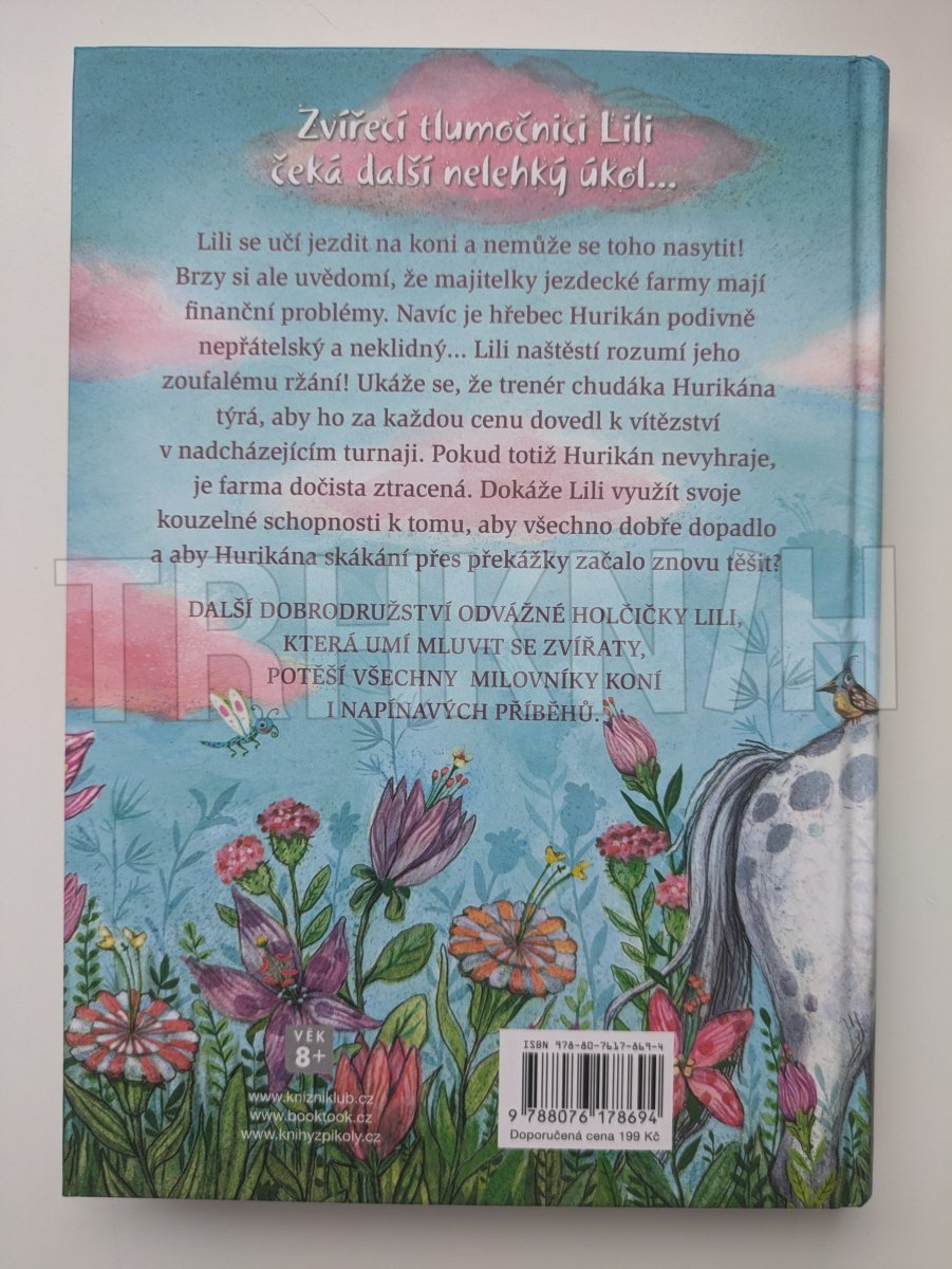 Lili se učí jezdit na koni a nemůže se toho nasytit! Brzy si ale uvědomí, že majitelky jezdecké farmy mají finanční problémy. Navíc je hřebec Hurikán podivně nepřátelský a neklidný… Lili naštěstí rozumí jeho zoufalému ržání! Ukáže se, že trenér chudáka Hurikána brutálně týrá, aby ho za každou cenu dovedl k vítězství v nadcházejícím turnaji. Pokud totiž Hurikán nevyhraje, je farma dočista ztracená. Dokáže Lili využít svoje kouzelné schopnosti k tomu, aby všechno dobře dopadlo a aby Hurikána skákání přes překážky začalo znovu těšit? Další díl oblíbené série o statečné Lili, která dokáže mluvit se zvířaty, je určená čtenářkám od 8 let.