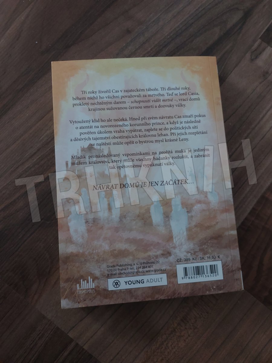 Young adult fantasy americké autorky přivádí na scénu hrdinu, jenž vidí mrtvé a zachraňuje zemi zdecimovanou válečnými útrapami.Tři roky živořil Cas v zajateckém táboře. Tři dlouhé roky, během nichž ho všichni považovali za mrtvého. Teď se lord Cassia, prokletý nechtěným darem - schopností vidět mrtvé -, vrací domů krajinou sužovanou černou smrtí a dozvuky války. Vytoužený klid ho ale nečeká. Hned při svém návratu Cas zmaří pokus o atentát na novorozeného korunního prince, a když je následně pověřen úkolem vraha vypátrat, zaplete se do politických sítí a děsivých tajemství obestírajících královnu Jehan. Při jejich rozplétání se naštěstí může opřít o bystrou mysl krásné Leny. Mladík pronásledovaný vzpomínkami na prožitá muka je jediným mužem království, který může všechny hádanky rozluštit, a zabránit tak opětovnému vypuknutí války.