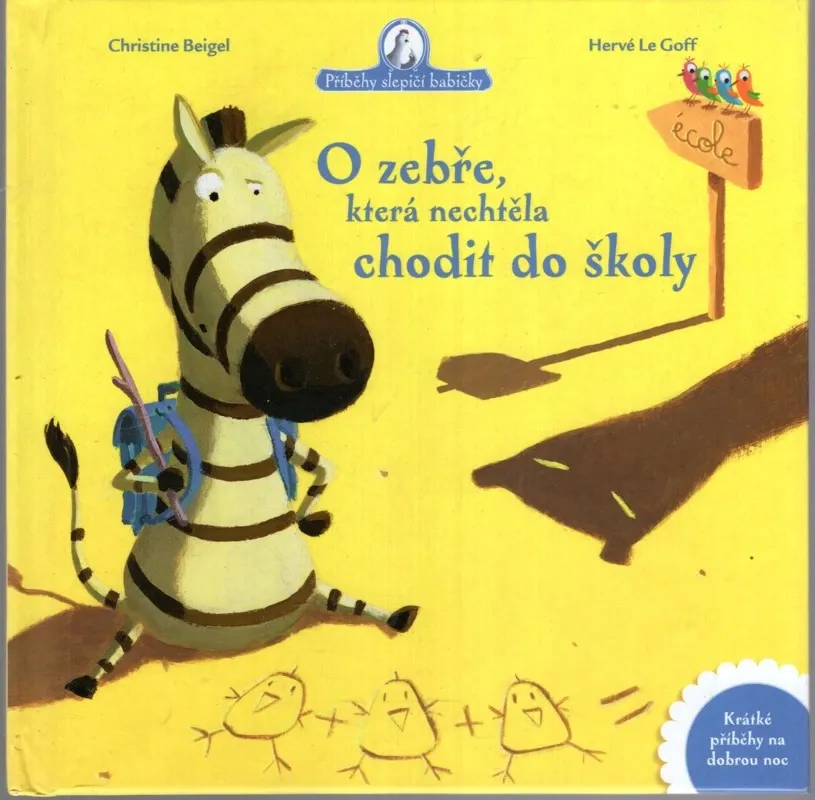 Malá zebra si myslela, že je chytřejší než ostatní a nemusí ani chodit do školy. Až potkala pantera, který jí začal klást podivné otázky. Stačily jí její znalosti, aby se před šelmou zachránila? To se dozvíte v Příbězích slepičí babičky.